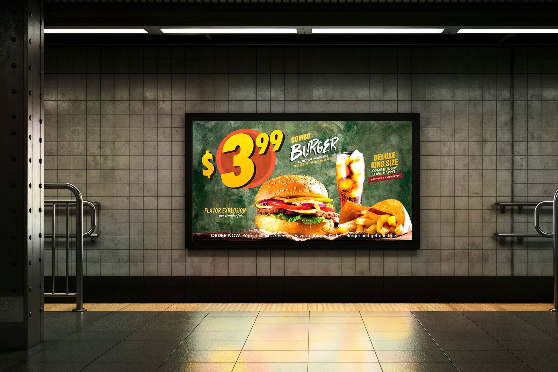Vibrant, retro-inspired fast-food billboard design perfect as wall art or as a realistic stage/film prop.