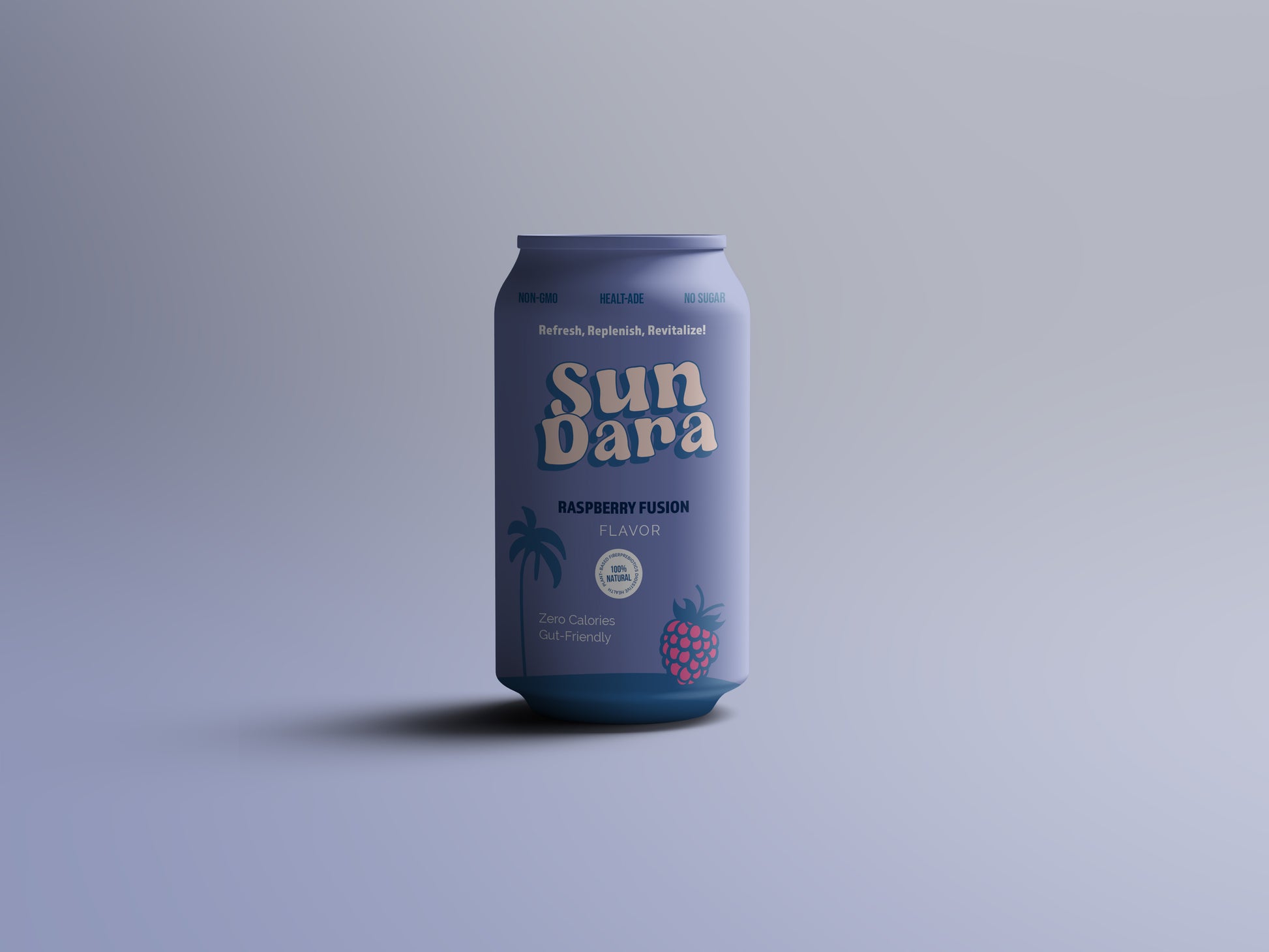 This artwork delivers the authentic look of a wellness soda with playful retro typography in soft peach and navy set against a muted purple background. The label features a bold raspberry illustration, eco-friendly recycling icons, barcode, and full product description, making it look indistinguishable from a real consumer brand. Its trendy aesthetic is ideal for health-focused or urban lifestyle settings.