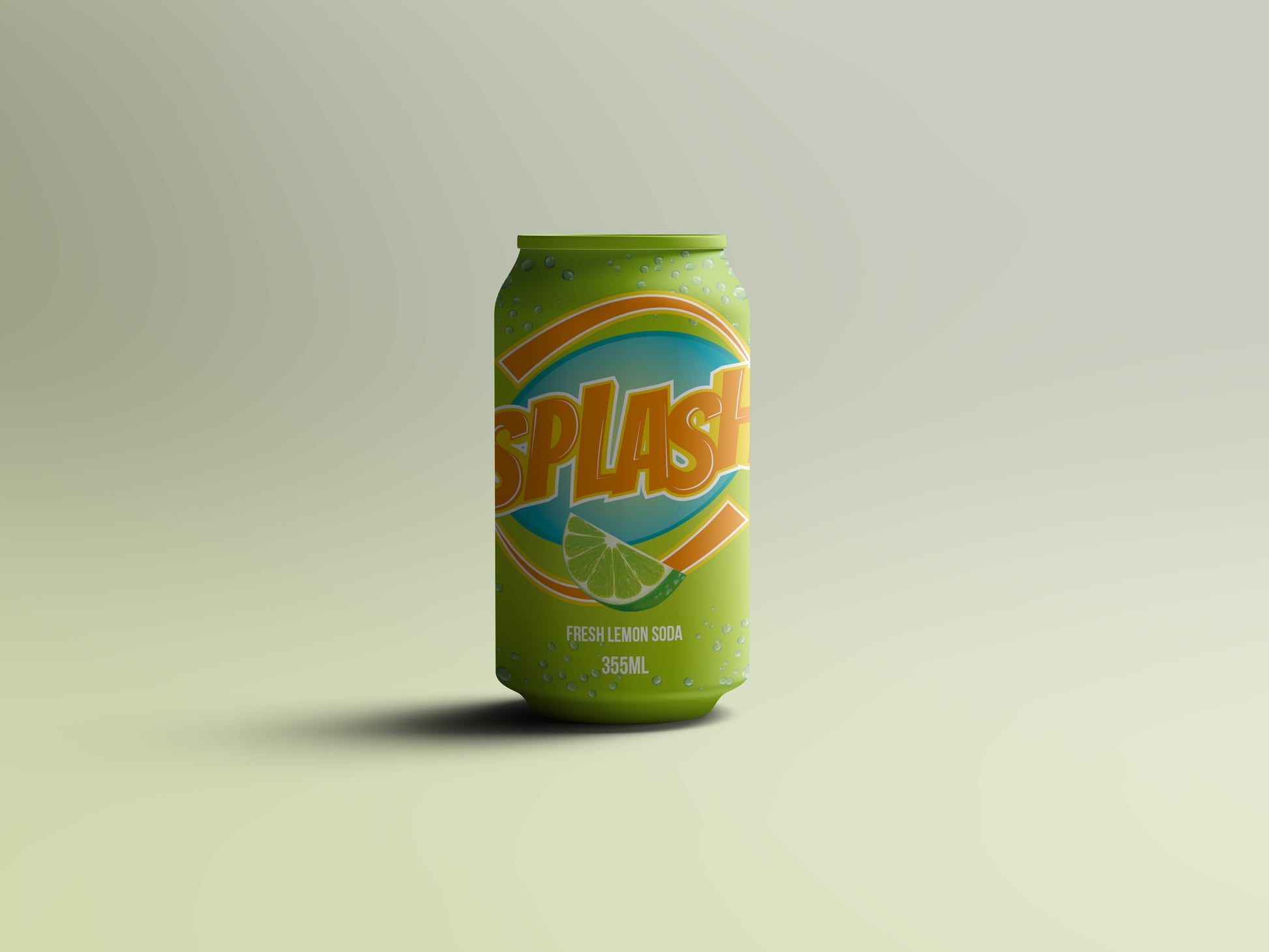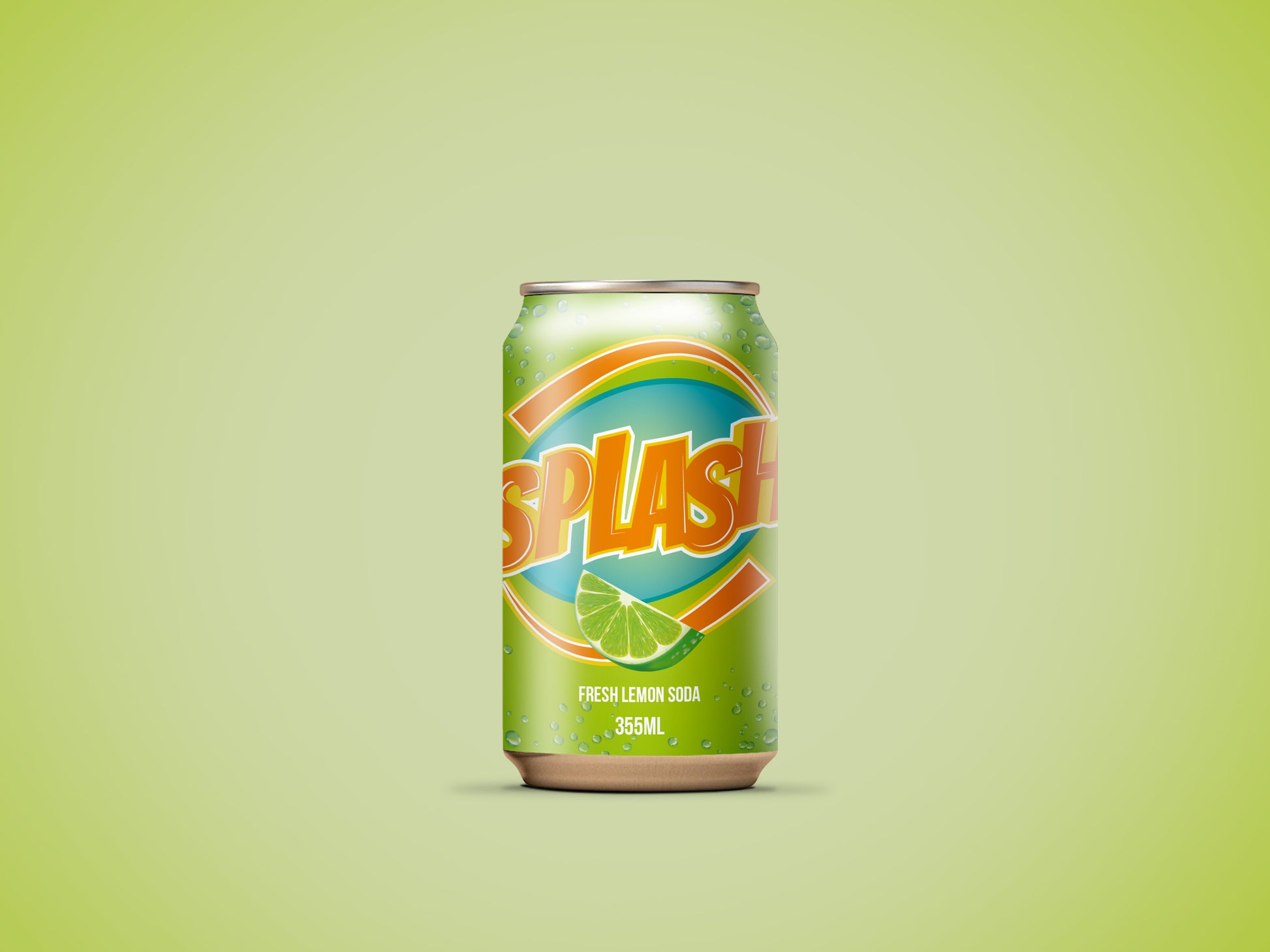 This design features a bold retro-inspired logo, SPLASH, in bright orange outlined with white and yellow, set against a vivid green background with water droplets for a refreshing effect. A lime wedge illustration emphasizes its “Fresh Lemon Soda” flavor, while the energetic circular logo adds motion and a playful summer vibe. Barcode and ingredient text are included for a highly realistic look.
