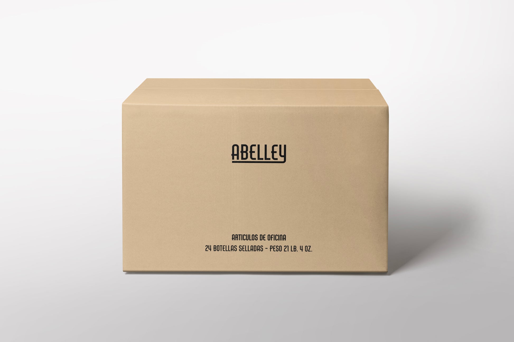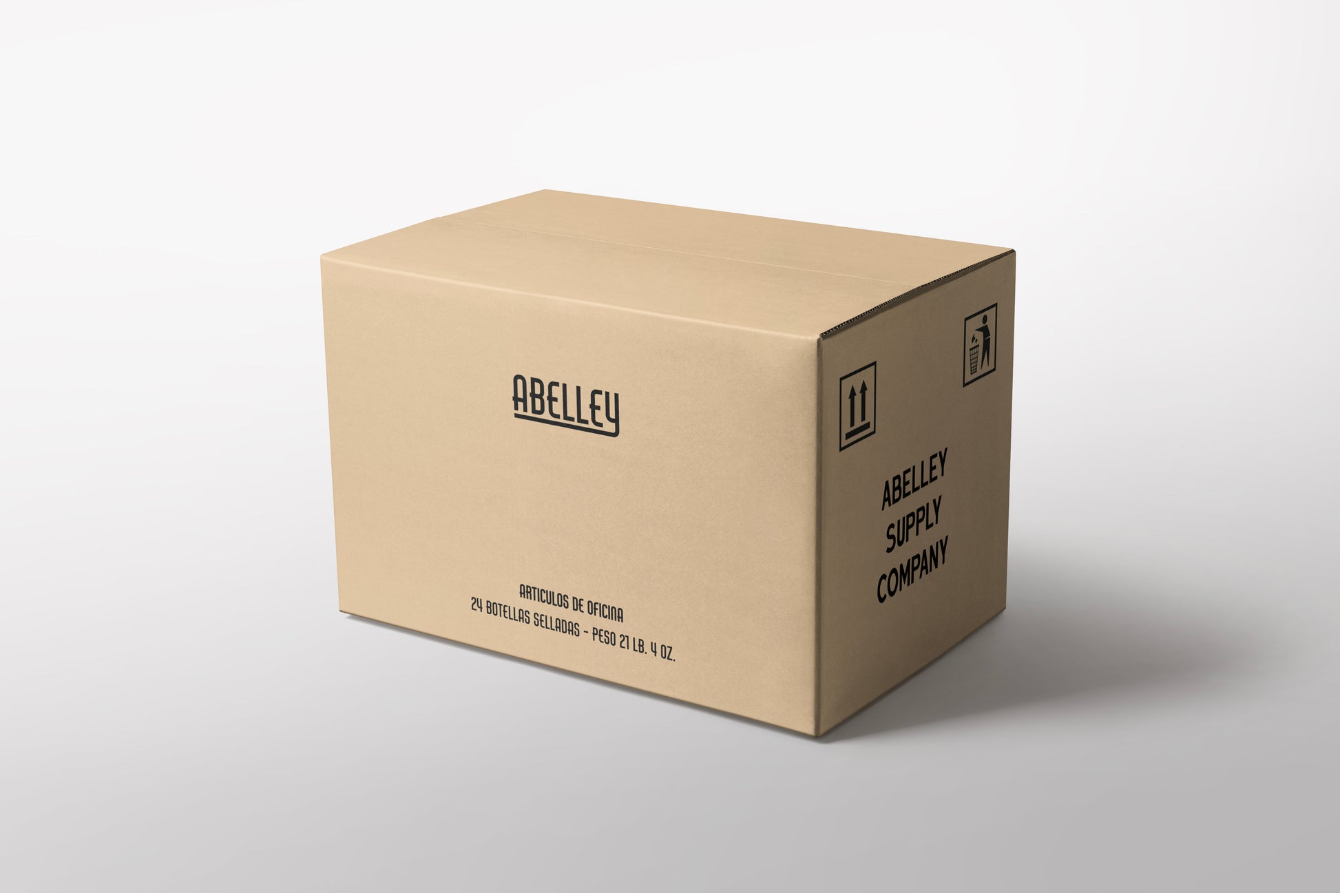 This artwork recreates the look of a contemporary yet timeless commercial shipping box used for office and institutional supplies. Printed over a natural kraft cardboard texture, the design features clean black typography, universal handling icons, and bilingual-style industrial markings. The fictional brand name Abelley appears with a restrained, modernist logotype, while Spanish text such as “Artículos de Oficina” and “24 Botellas Selladas – Peso 21 lb. 4 oz.” adds authenticity and international logistics realism. The understated graphic approach makes the box feel genuinely utilitarian and production-ready.