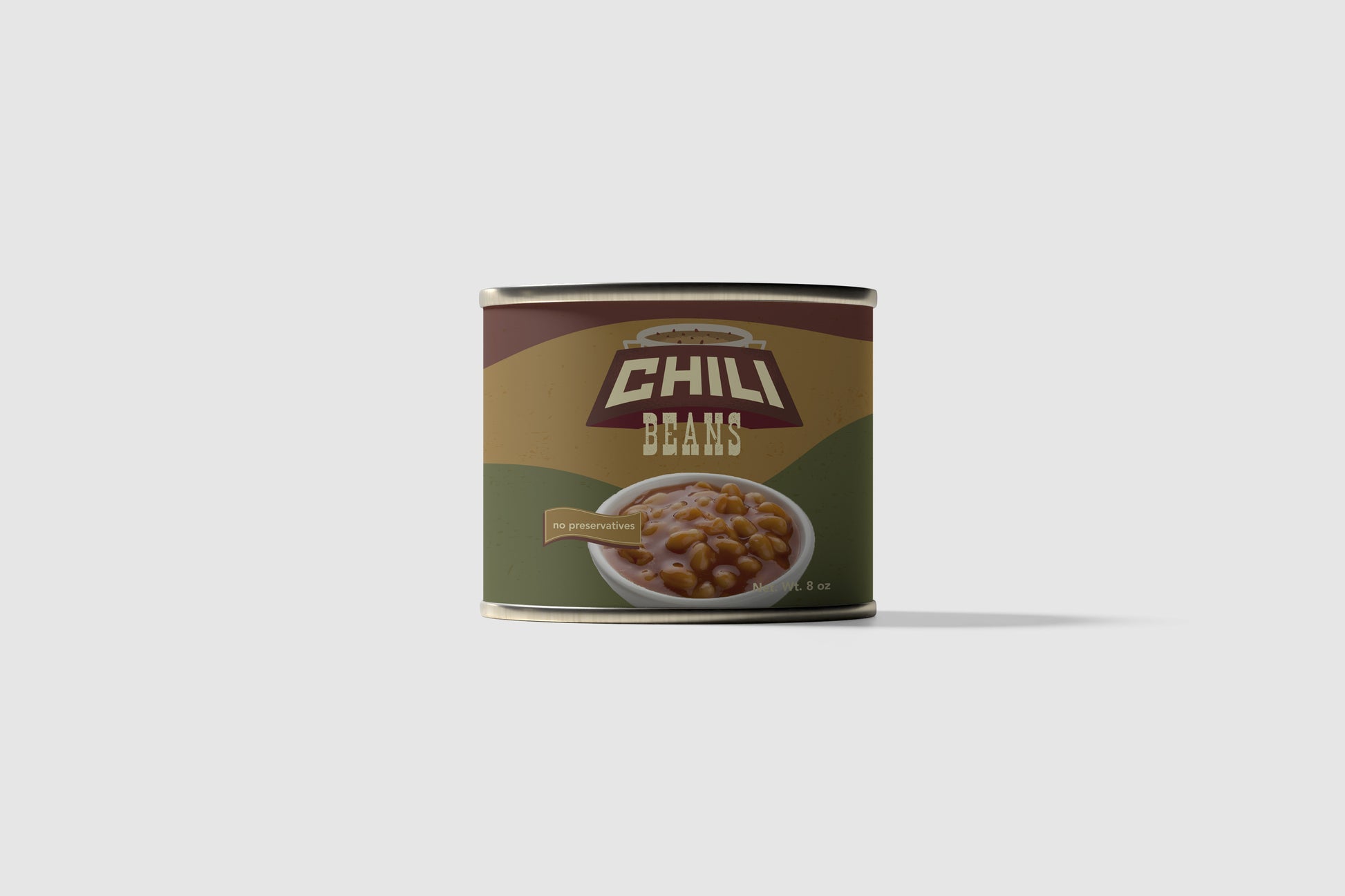 A bold, vintage-inspired chili beans can label designed to look completely authentic on camera. This full-color artwork features rustic color blocking in deep maroon, golden tan, and earthy green, paired with distressed typography that evokes classic pantry staples. The central CHILI BEANS badge has a retro western feel, complemented by a realistic bowl of chili beans, a “no preservatives” ribbon, and a full Nutrition Facts panel for believable product accuracy.