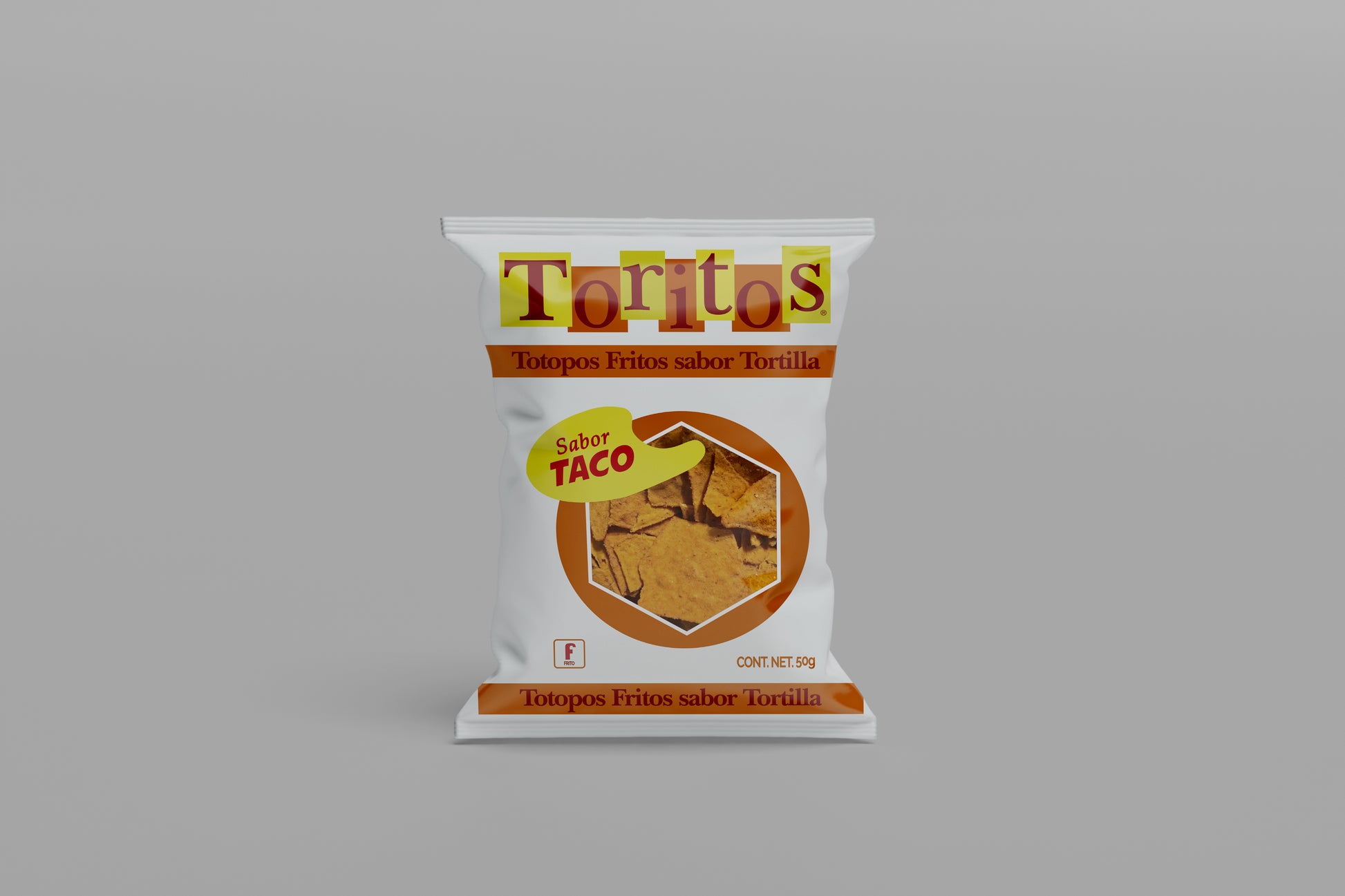 This artwork captures the authentic look of a traditional tortilla chips package, featuring a clean white base with warm orange and brown accents and bold, vintage-inspired typography. The front highlights a playful taco-flavor badge and a central product window graphic, while the back includes illustrated serving suggestions, dips, and recipe-style icons that enhance its realism. The overall design feels familiar, affordable, and unmistakably supermarket-ready on camera.