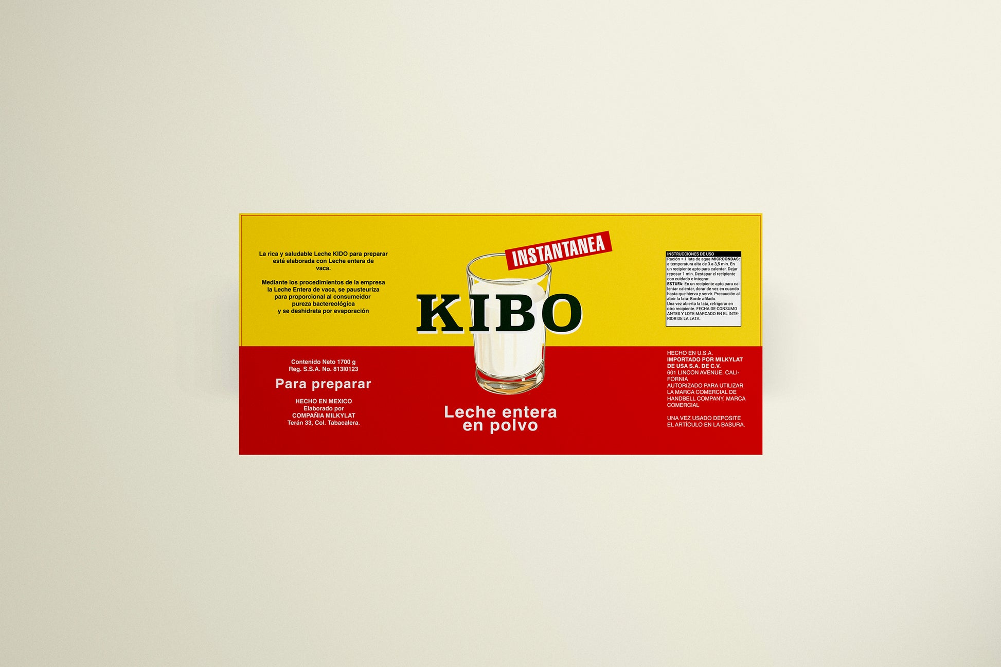 This artwork captures the bold, high-contrast look of classic Mexican and Latin American food packaging. The design is divided into strong yellow and red color blocks, anchored by a central illustration of a glass of milk and heavy vintage typography. Spanish product copy, preparation instructions, net weight, and origin details are laid out in a period-accurate style, evoking late-20th-century pantry staples and mass-market branding.