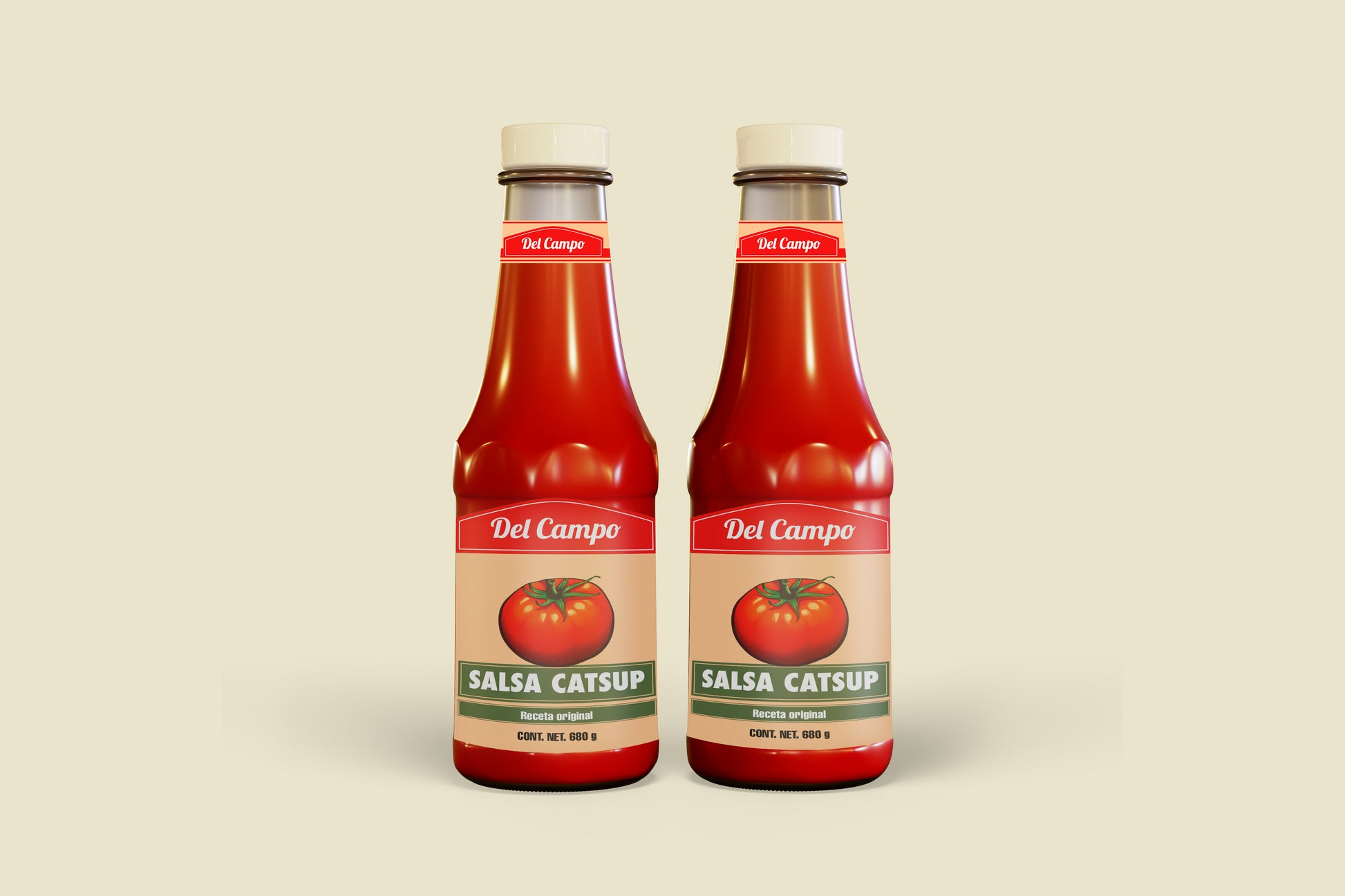 This artwork features a traditional Latin pantry aesthetic with warm beige tones, bold red branding, and a hand-illustrated tomato centerpiece. The label design evokes classic grocery packaging, with clean typography, strong color blocking, and authentic product details that make it look like a real mass-market condiment. Its timeless, slightly retro style fits perfectly in kitchen scenes, food markets, restaurants, or family dining settings.