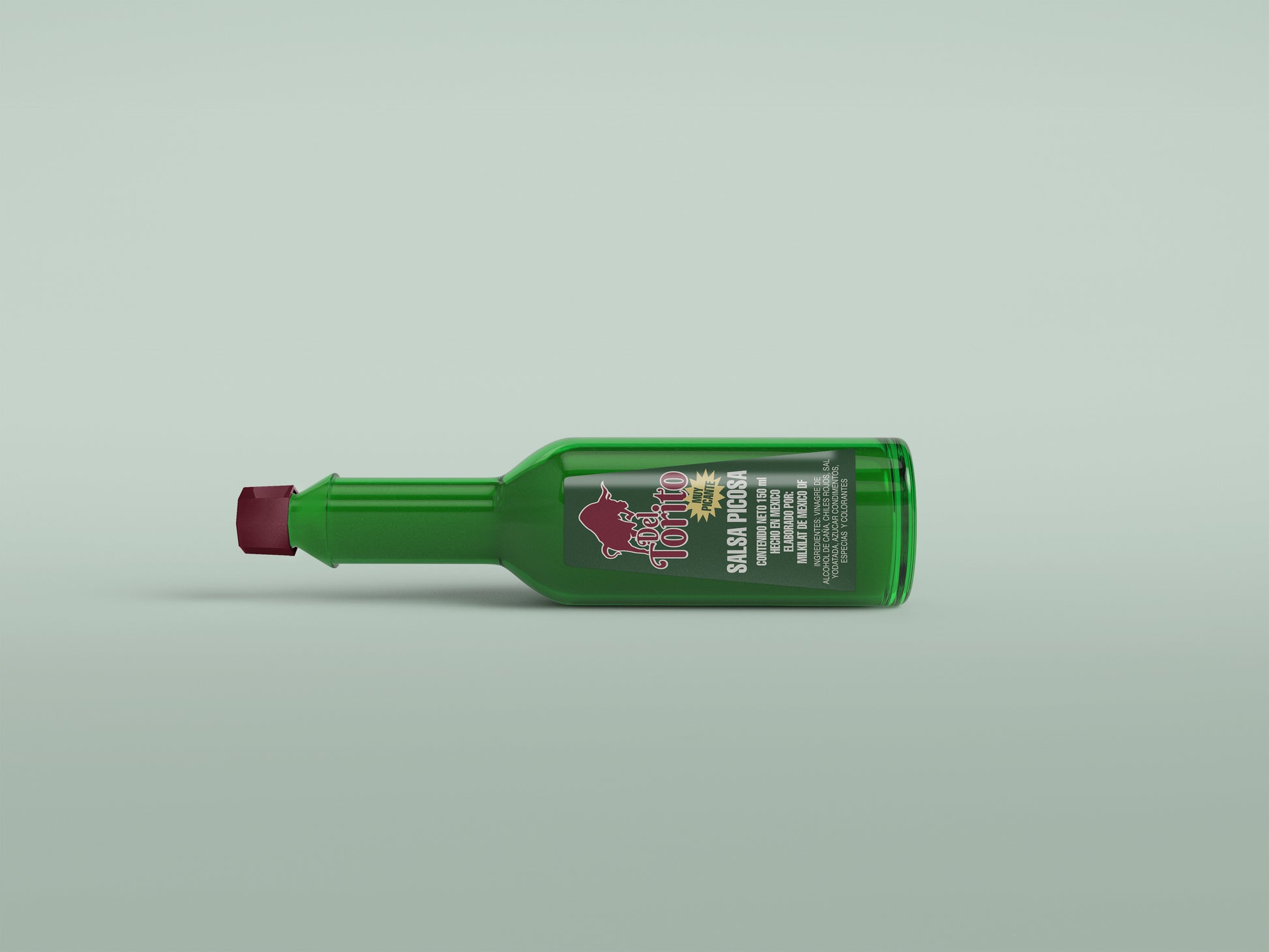 This digital artwork features a bold, traditional-style salsa label inspired by classic Mexican hot sauce branding. The design uses a deep green background paired with strong red and white typography, highlighted by a dynamic bull illustration and a starburst accent calling out extra spiciness. The tall, tapered layout mimics authentic small-batch sauce bottles commonly seen in taquerías, street food stands, and household kitchens, delivering a highly believable consumer product look on camera.
