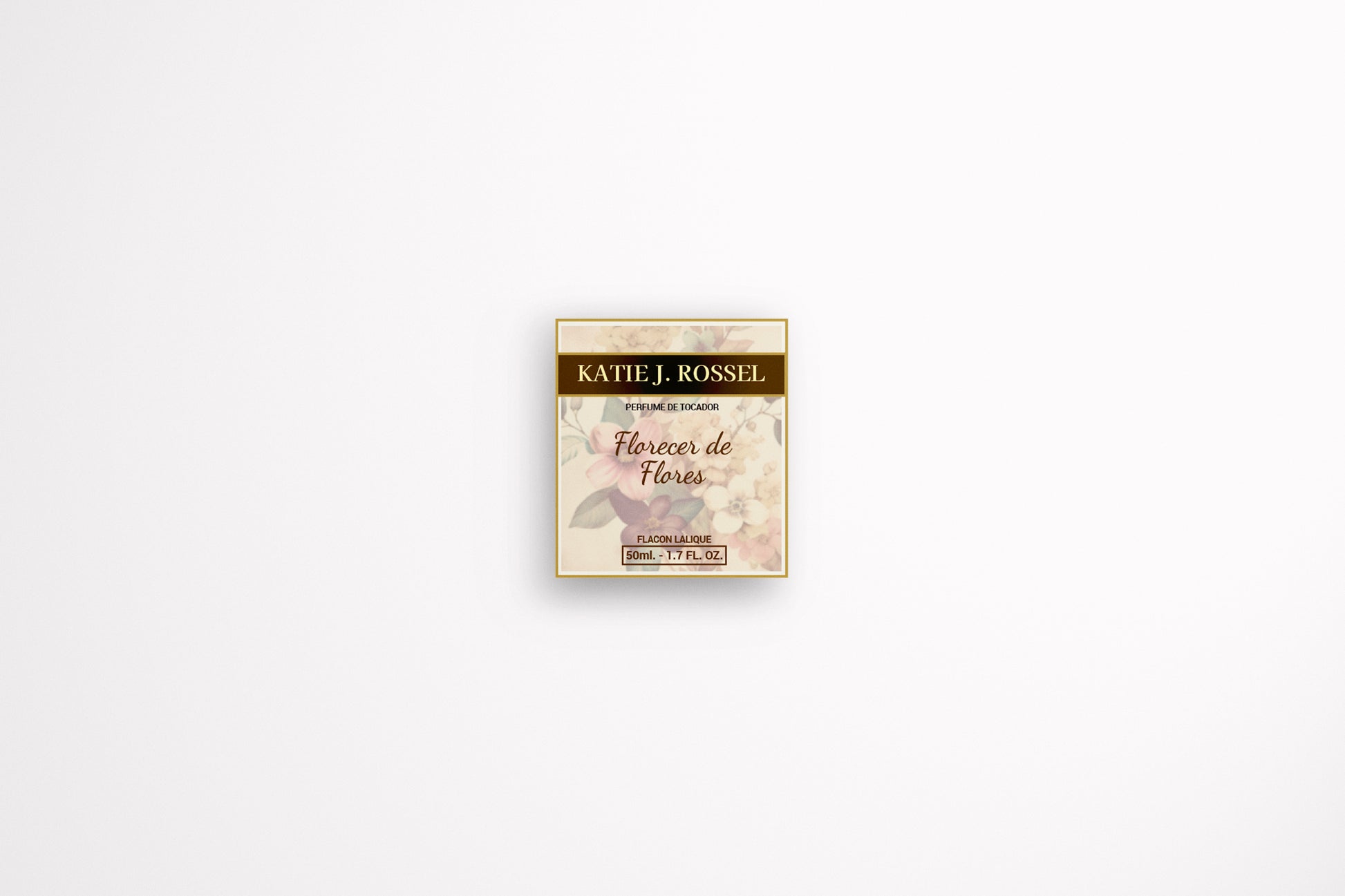 This artwork features a refined, romantic perfume packaging design with a soft pastel floral background and warm ivory tones framed by subtle gold accents. The composition evokes classic European perfumery, blending vintage charm with contemporary clarity. The label presents the brand name KATIE J. ROSSEL, the fragrance title Florecer de Flores, and the descriptor Perfume de Tocador, creating the impression of an artisanal, boutique fragrance brand. Delicate botanical illustrations add depth and femininity while maintaining a clean, cinematic look.