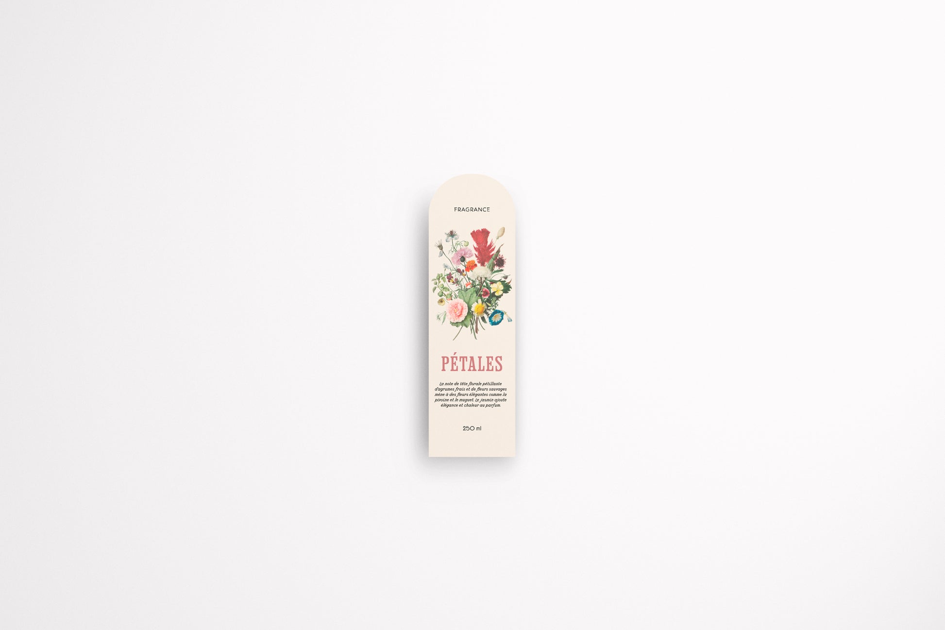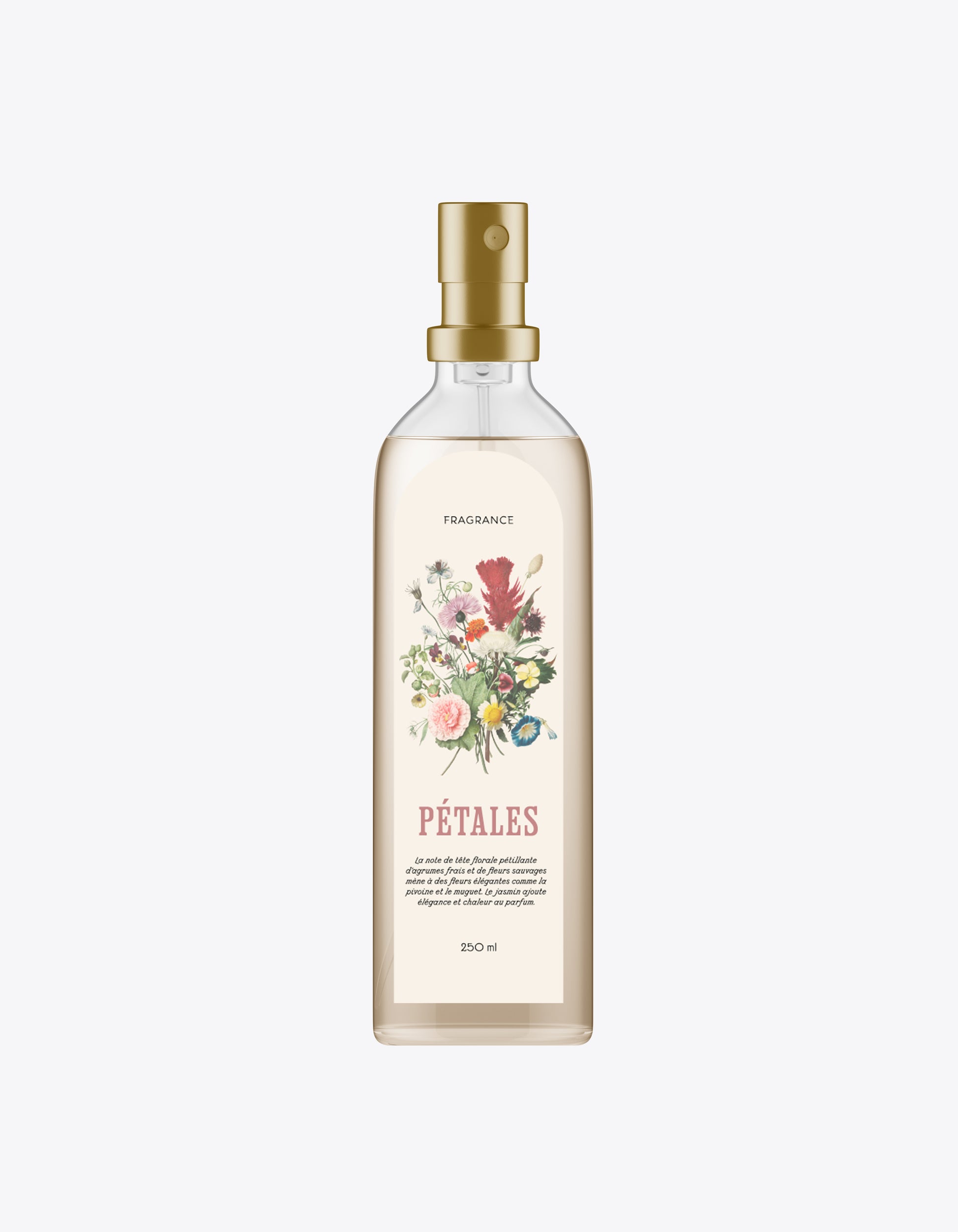 This artwork showcases the delicate charm of a floral perfume label, featuring soft pastel colors and a vintage-inspired bouquet illustration. The design is complemented by a clean, modern font and French typography for the fragrance name, "PÉTALES." The label includes a short description of the fragrance and the volume (250 ml), making it look like a high-quality, boutique perfume brand. Its refined and romantic aesthetic is ideal for luxury beauty, lifestyle, or vintage-themed settings.