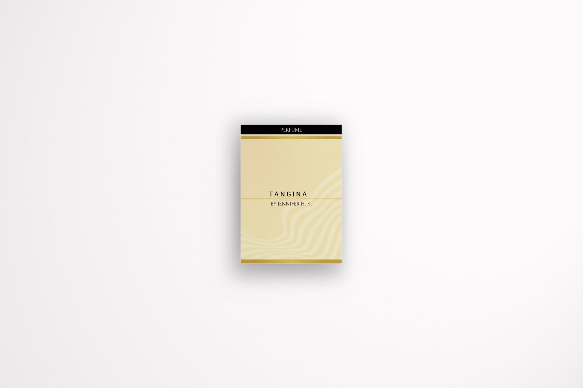 This artwork presents a sleek, high-end perfume packaging design with a soft ivory and gold color scheme. Clean, modern typography is paired with subtle flowing line patterns that add depth and elegance without overpowering the layout. The design features the fragrance name TANGINA and the credit line by Jennifer H. K., along with a discreet “Perfume” header, creating the impression of a premium designer fragrance brand seen in upscale boutiques.