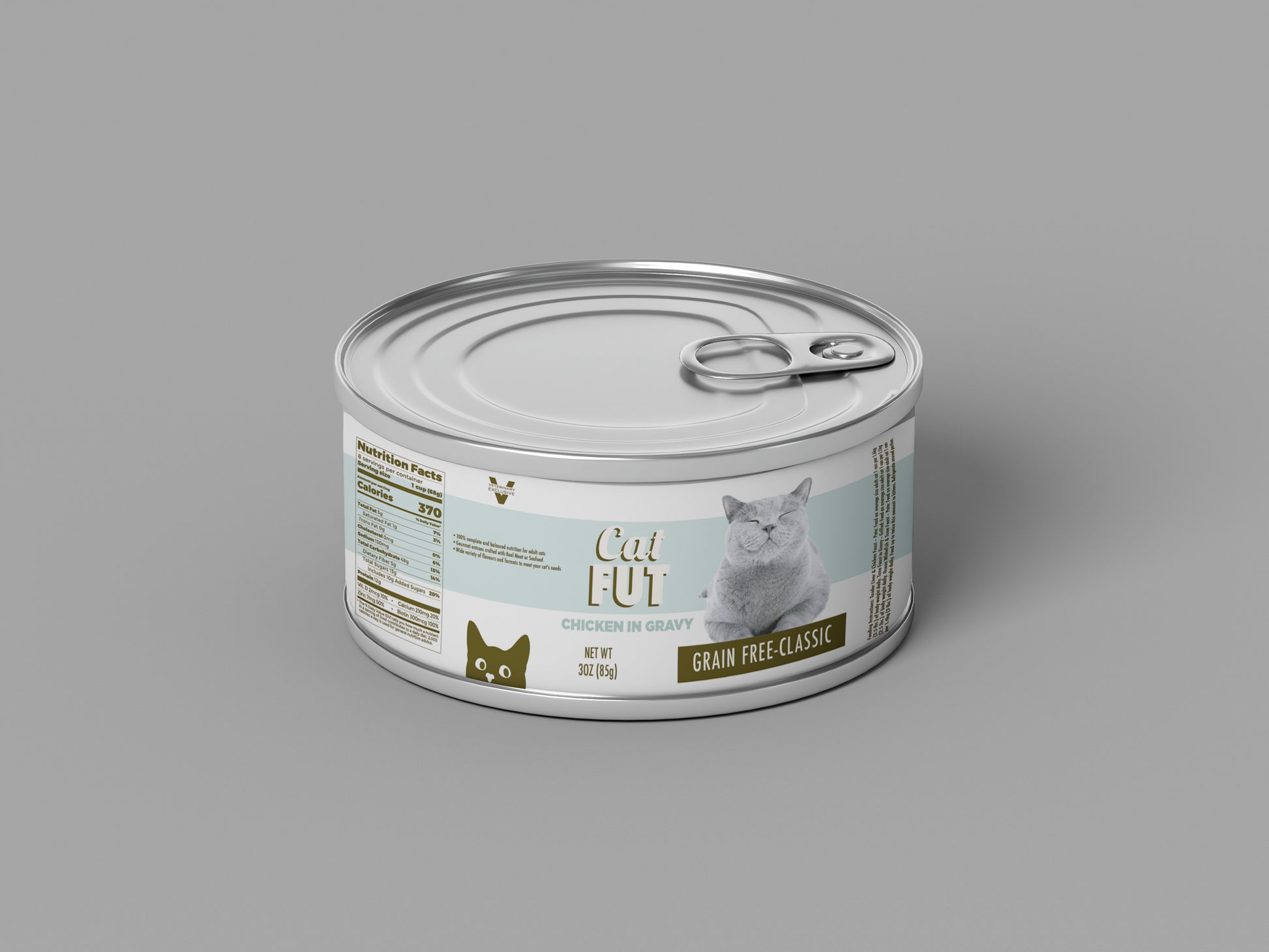 This artwork recreates the look of a premium grain-free cat-food brand with a clean, contemporary aesthetic. The label features soft mint-green and white stripes, elegant sans-serif typography, and an olive accent bar highlighting the “Grain Free – Classic” flavor. A non-identifiable grey cat image adds realistic appeal, while detailed nutrition facts, feeding instructions, a barcode, and product description complete the believable consumer-grade layout. The design is ideal for close-up shots and authentic on-set presentation.