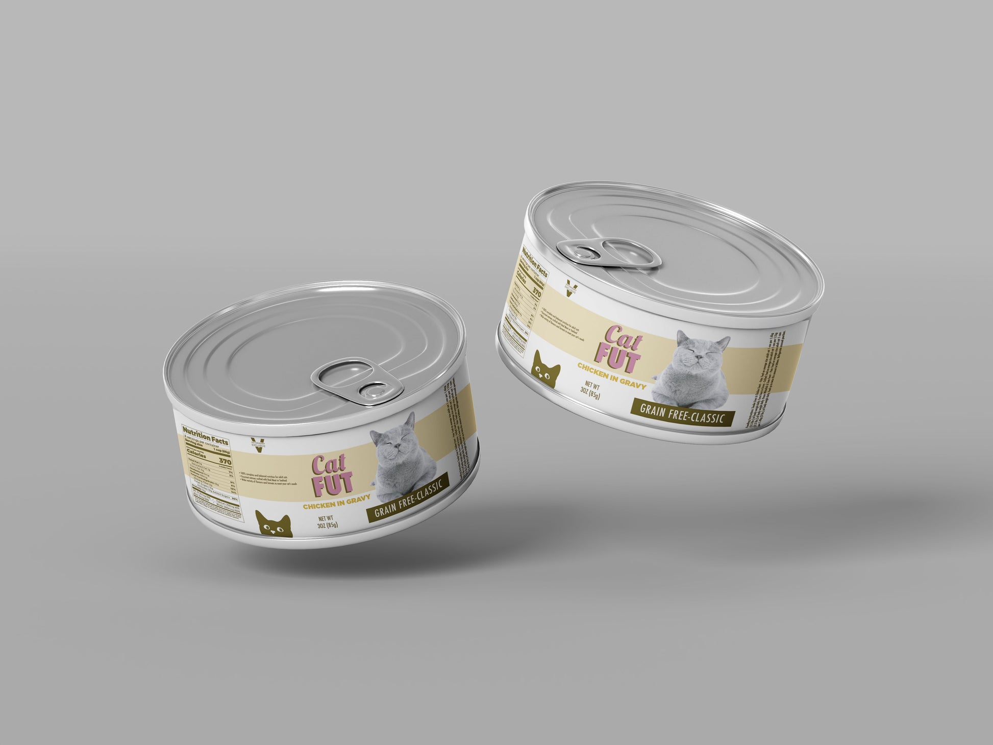 This artwork features a fresh, contemporary design for a grain-free cat food product. The label showcases a soft, pastel yellow background, highlighted with bold, retro typography for the brand name "Cat FUT" in vibrant pink. The tagline "Grain Free-Classic" is elegantly presented on a contrasting green ribbon. A charming image of a contented gray cat adds a playful touch. Detailed nutrition facts and a minimalist barcode give the label an authentic, consumer-ready look.