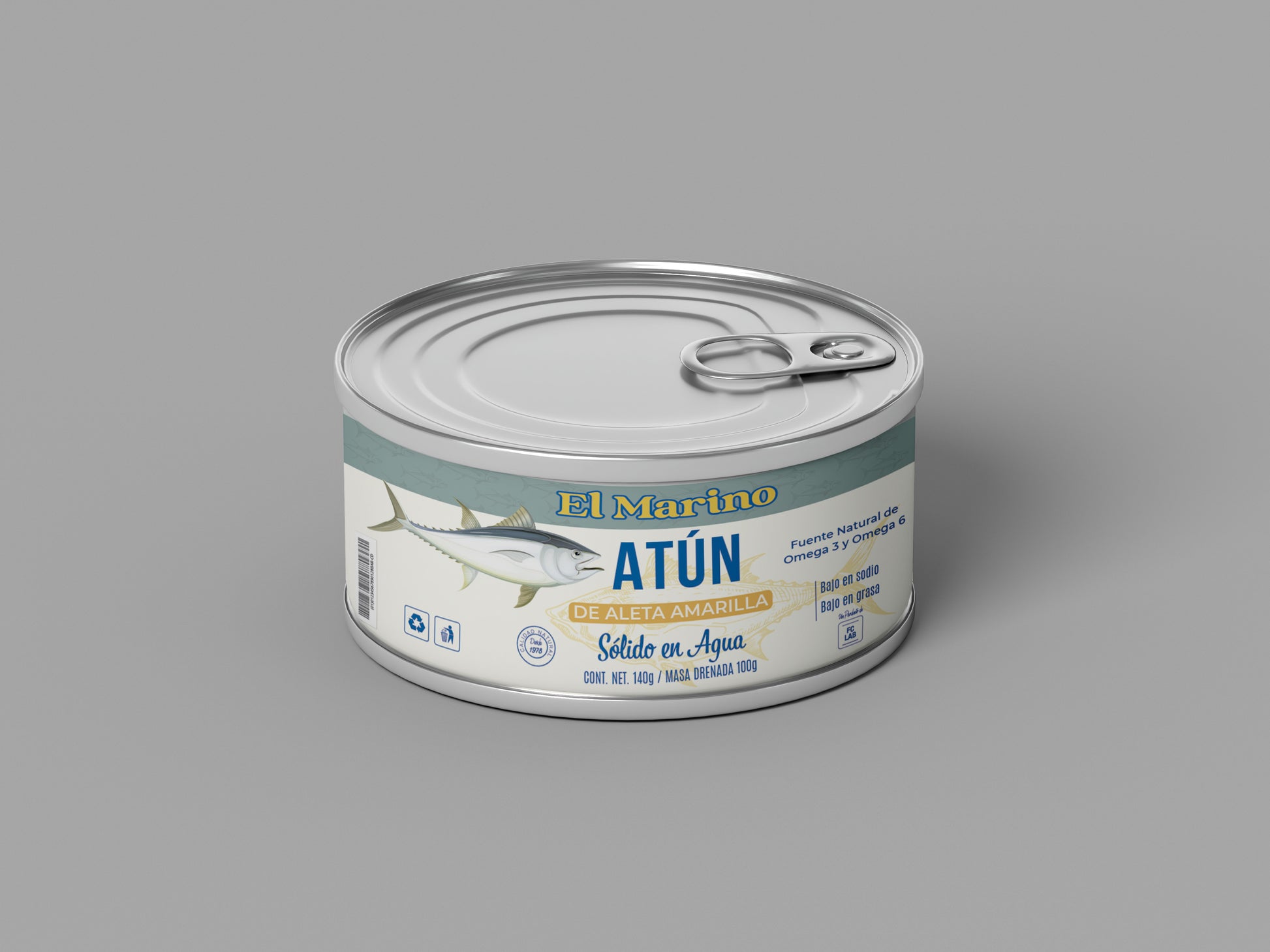 This artwork captures the look of a clean, natural-style cat-food brand, using a soft sea-green and cream palette with subtle texture accents. The label features an illustrated tuna, clear nutritional callouts, eco-friendly recycling icons, barcode, and product details that mimic real commercial packaging. Its bright, wholesome aesthetic makes it ideal for kitchen, pantry, and grocery-store set environments, especially in close-up shots.
