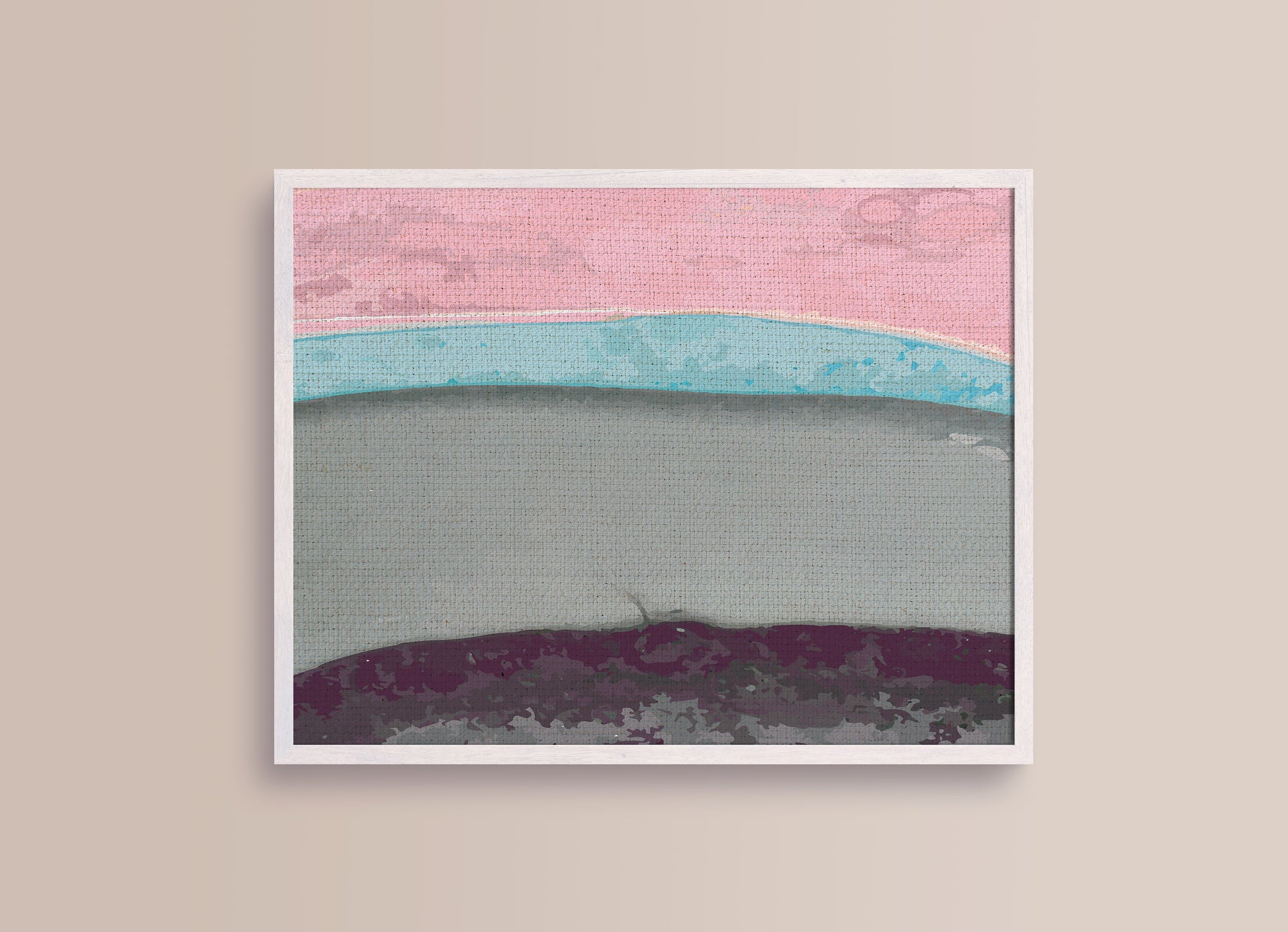 “Abstract Brushstokes” unfolds in broad, layered brushstrokes of soft pink, aqua blue, muted grey, and deep violet. The composition feels both meditative and expansive, evoking the calm rhythm of landscapes while remaining firmly abstract and modern. Its painterly textures and tonal gradients invite quiet contemplation, making it equally suited for contemporary interiors or creative production design.