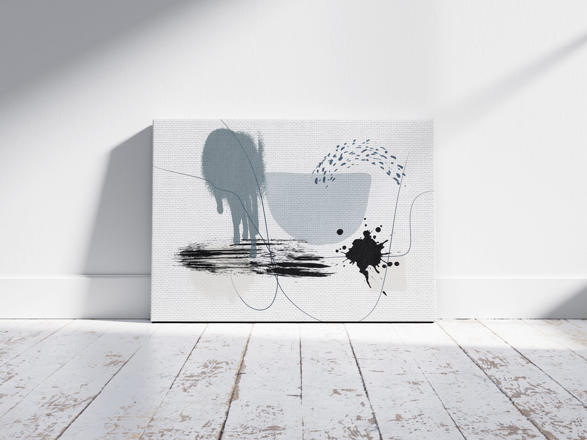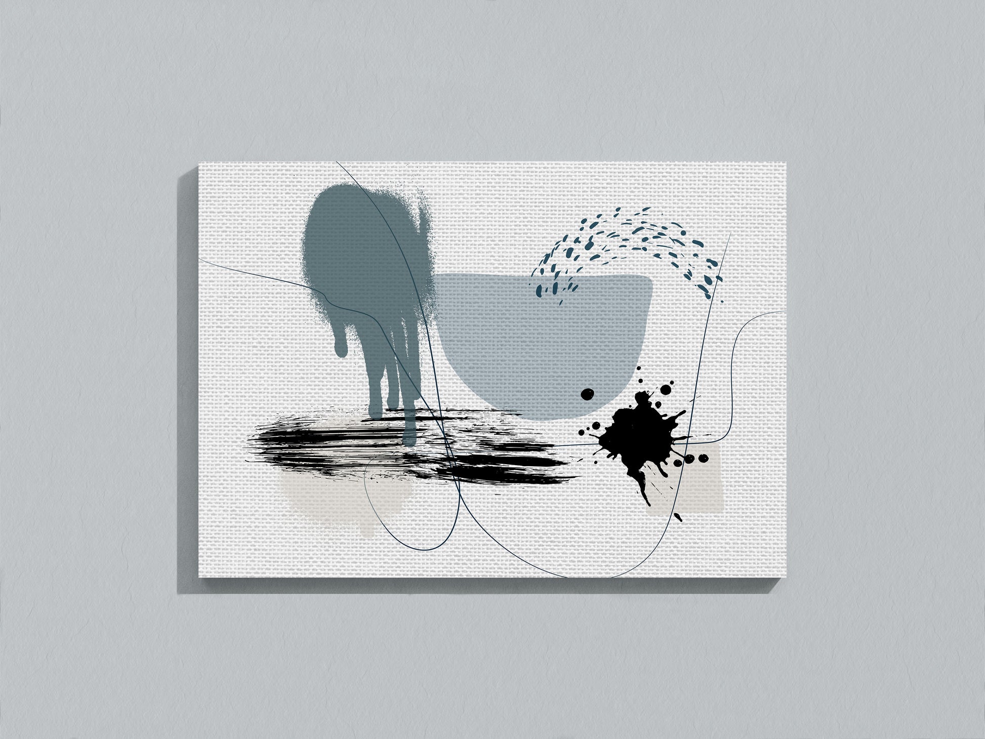 “Abstract Brushstroke Grey & Black” is a contemporary composition that blends expressive brushstrokes, bold ink stains, and fluid graphic lines over a textured canvas background. The balance between soft muted green and deep black creates contrast, rhythm, and movement, giving the piece both energy and elegance.