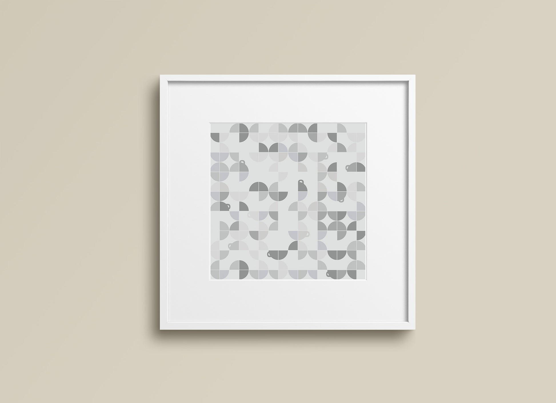 “Abstract Coffee Geometry Pattern Grey” reimagines the playful coffee cup motif in a muted grayscale palette. The repeating arrangement of half-circles and cup silhouettes creates a clean, geometric pattern that feels sophisticated and versatile.