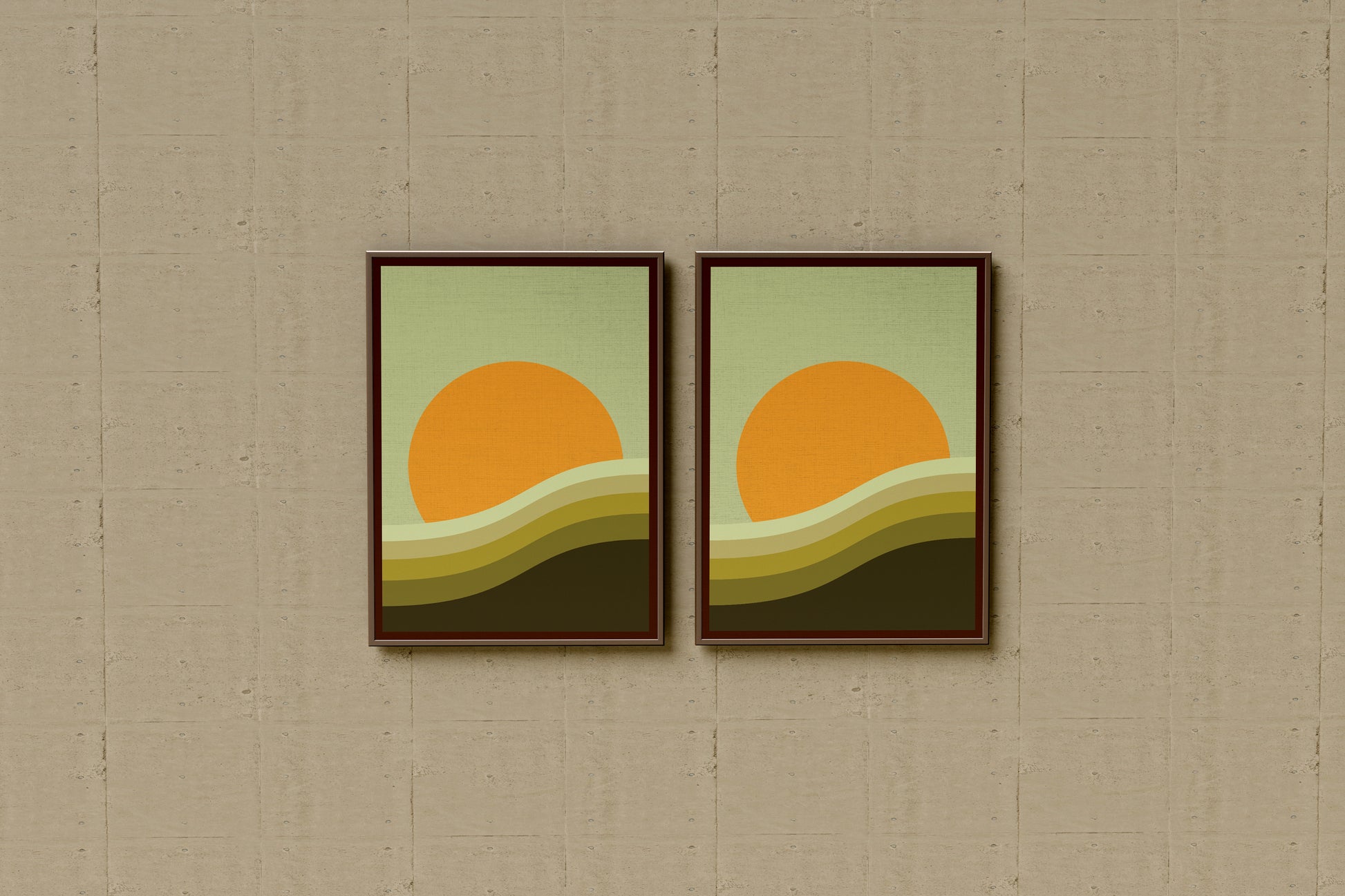 This artwork features a vibrant orange sun rising above a series of flowing, curved waves in earthy tones. The soothing pastel greens and yellows create a sense of calm and nostalgia, reminiscent of vintage 70s design aesthetics. The simplicity and warmth of this composition make it an ideal choice for adding a pop of retro style to any space or production setting.