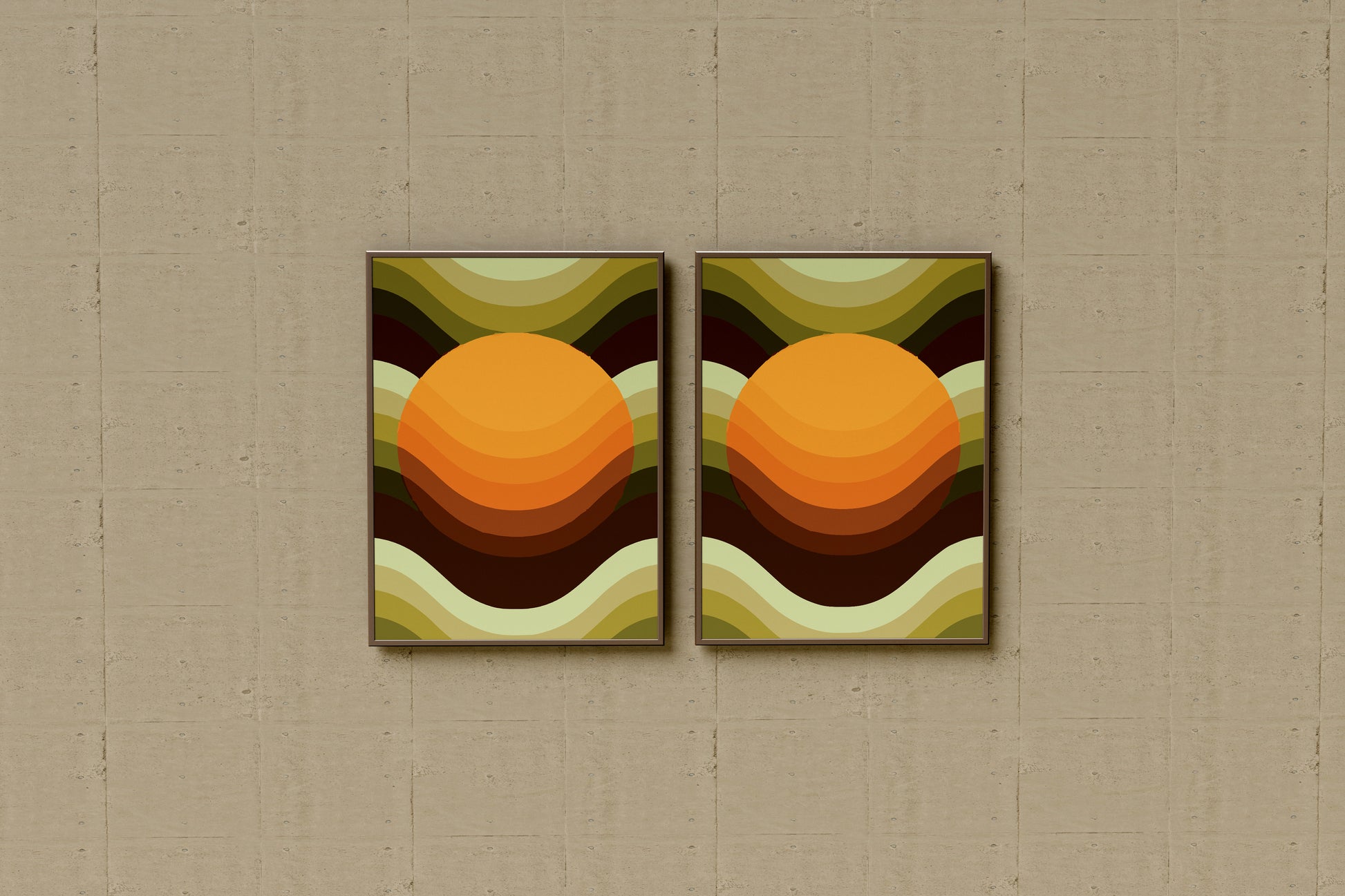 This artwork features a bold, abstract sun surrounded by wavy bands in warm retro hues, evoking the vibes of 1970s design. The fluid lines and gradient color scheme bring a sense of peace and nostalgia, making it ideal for any space that needs a pop of color and retro style.