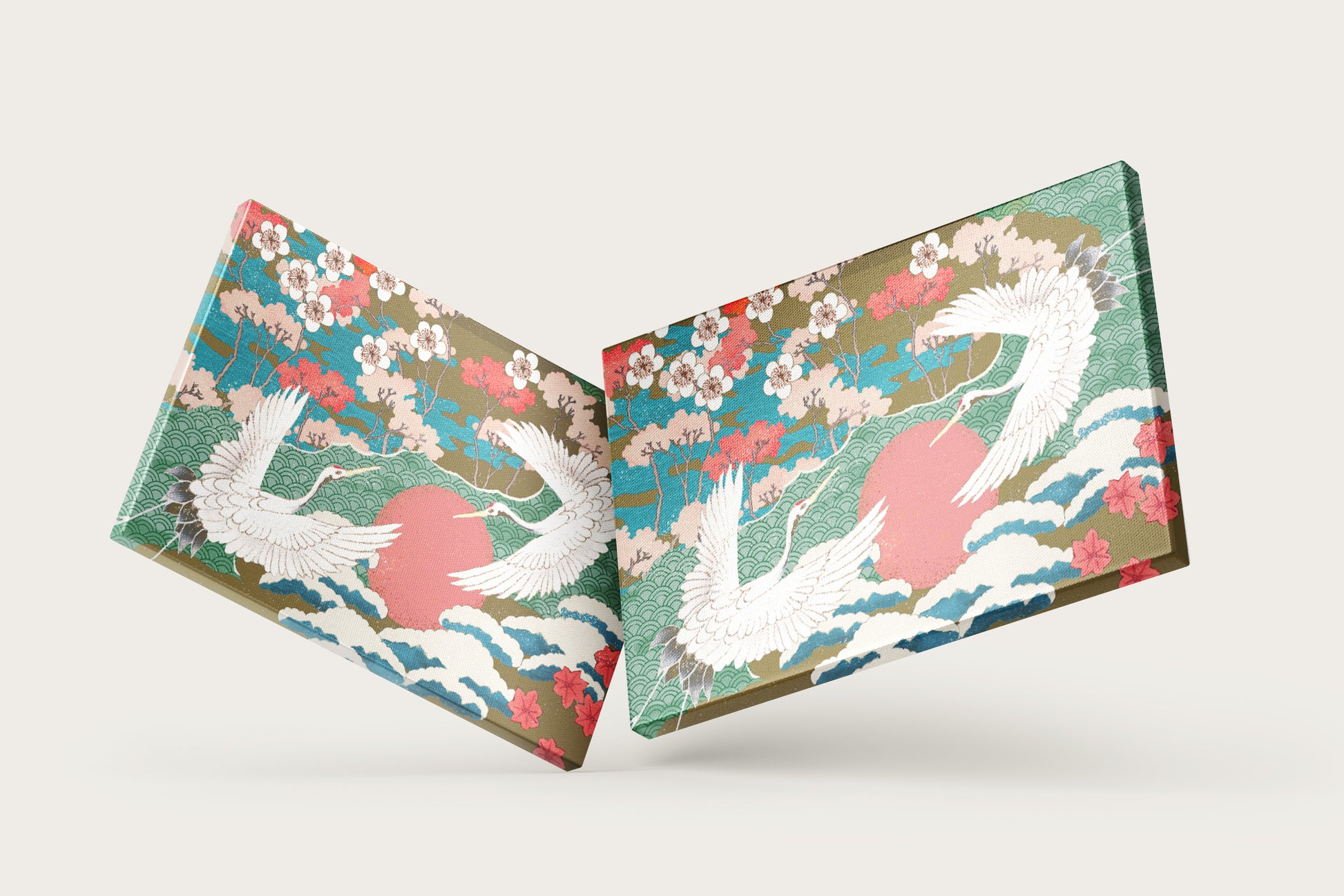 This artwork depicts two elegant white cranes in mid-flight against a richly patterned landscape, inspired by traditional Chinese woodblock prints. Featuring stylized waves, flowering trees, drifting clouds, and a soft red sun, the composition evokes calm, balance, and poetic movement. The muted yet textured color palette and layered motifs give it an authentic, timeless feel—perfect for period interiors or visually refined scenes.