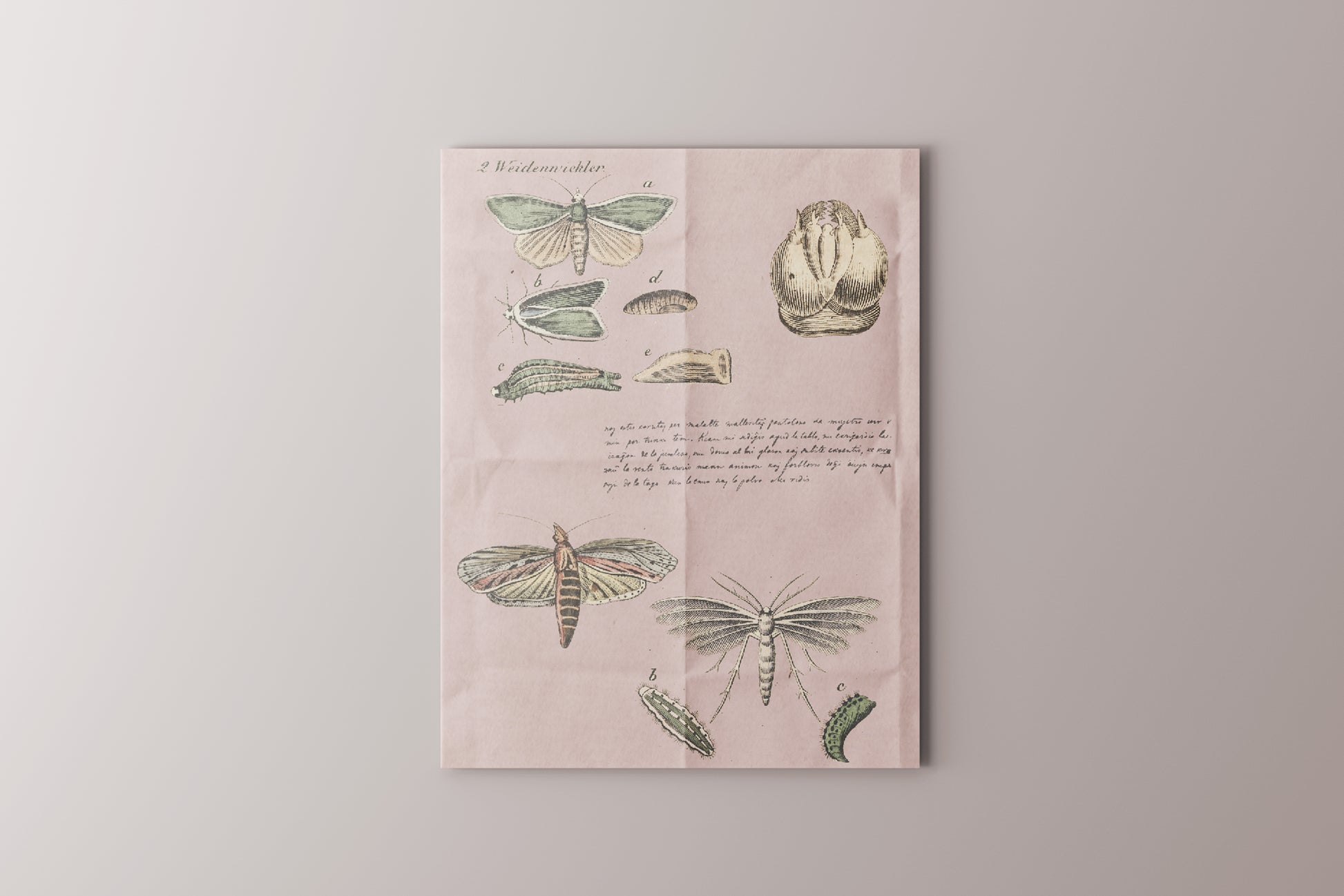 “Insect Metamorphosis” is a charming vintage-style scientific illustration showcasing the life cycle of moths and caterpillars. With fine ink detailing and soft hand-colored tones on a muted pink background, this print brings antique botanical plates to life. Latin script and delicate linework add an old-world scholarly appeal.