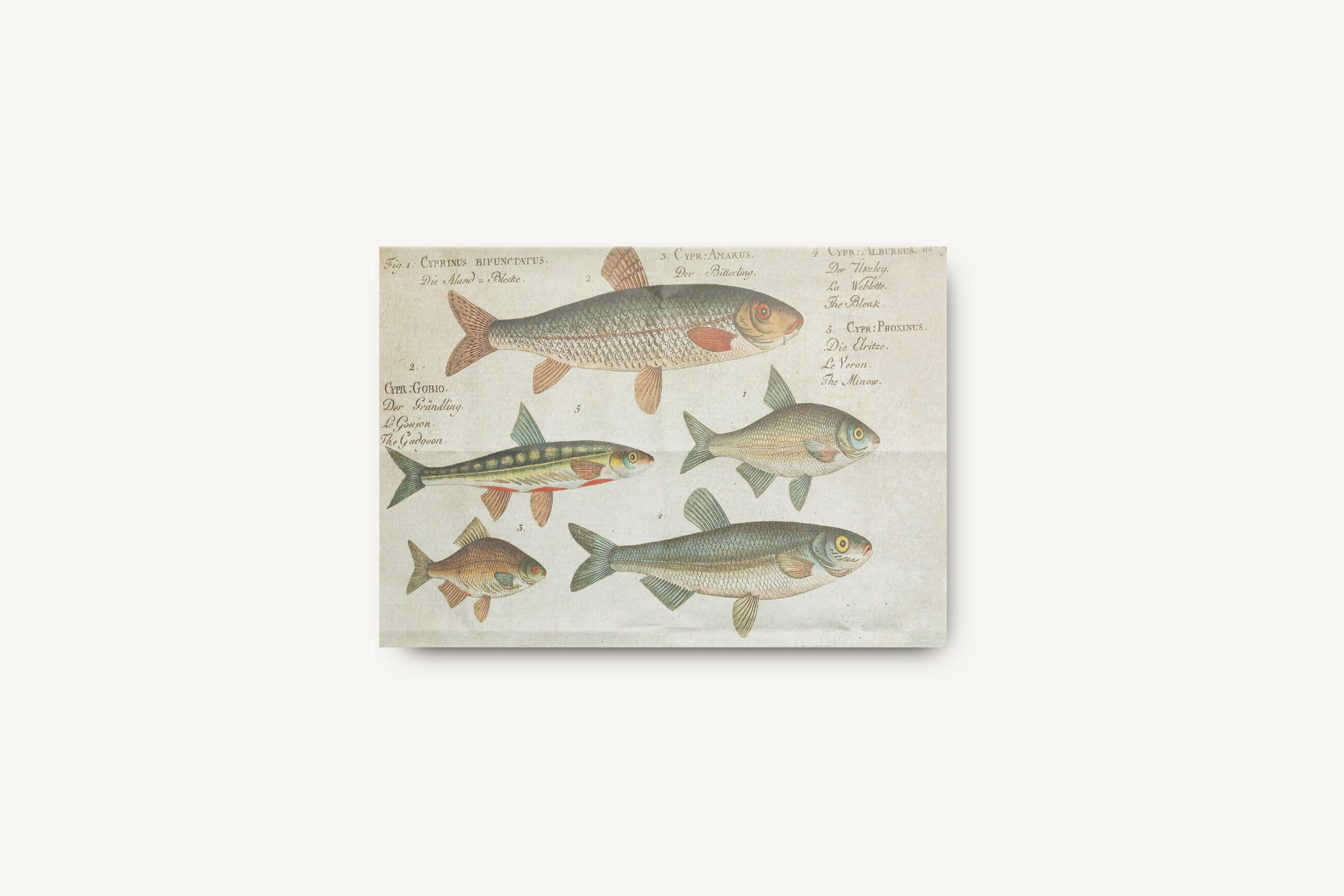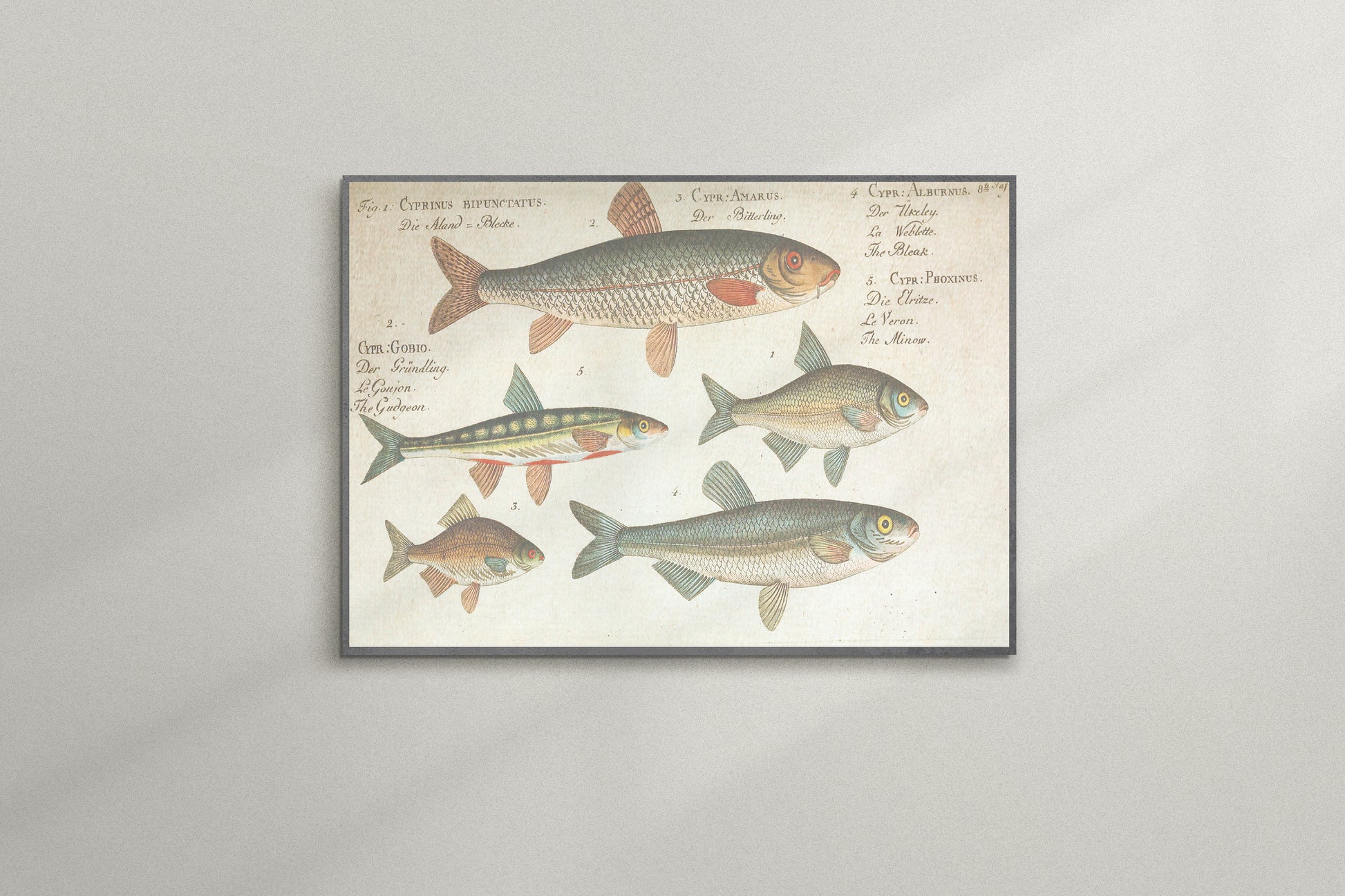 This artwork recreates the aesthetic of 18th–19th century scientific plates, featuring detailed hand-drawn freshwater fish studies with delicate coloration and annotated taxonomy in French and German. The softly aged paper texture and subtle patina give it the look of an authentic archival engraving pulled from a naturalist’s compendium.
