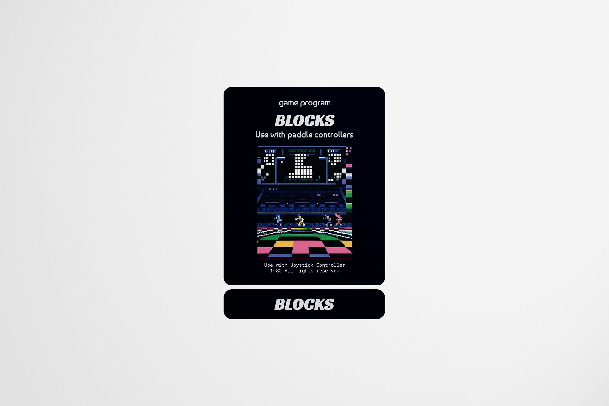 This artwork channels the visual language of early block-based arcade games, featuring a pixelated playfield, colorful geometric blocks, and tiny 8-bit characters set against a deep black background. The bold white “BLOCKS” title and faux instructional text mimic classic cartridge labels, while the neon color palette and grid-based composition evoke the unmistakable look of vintage arcade screens.