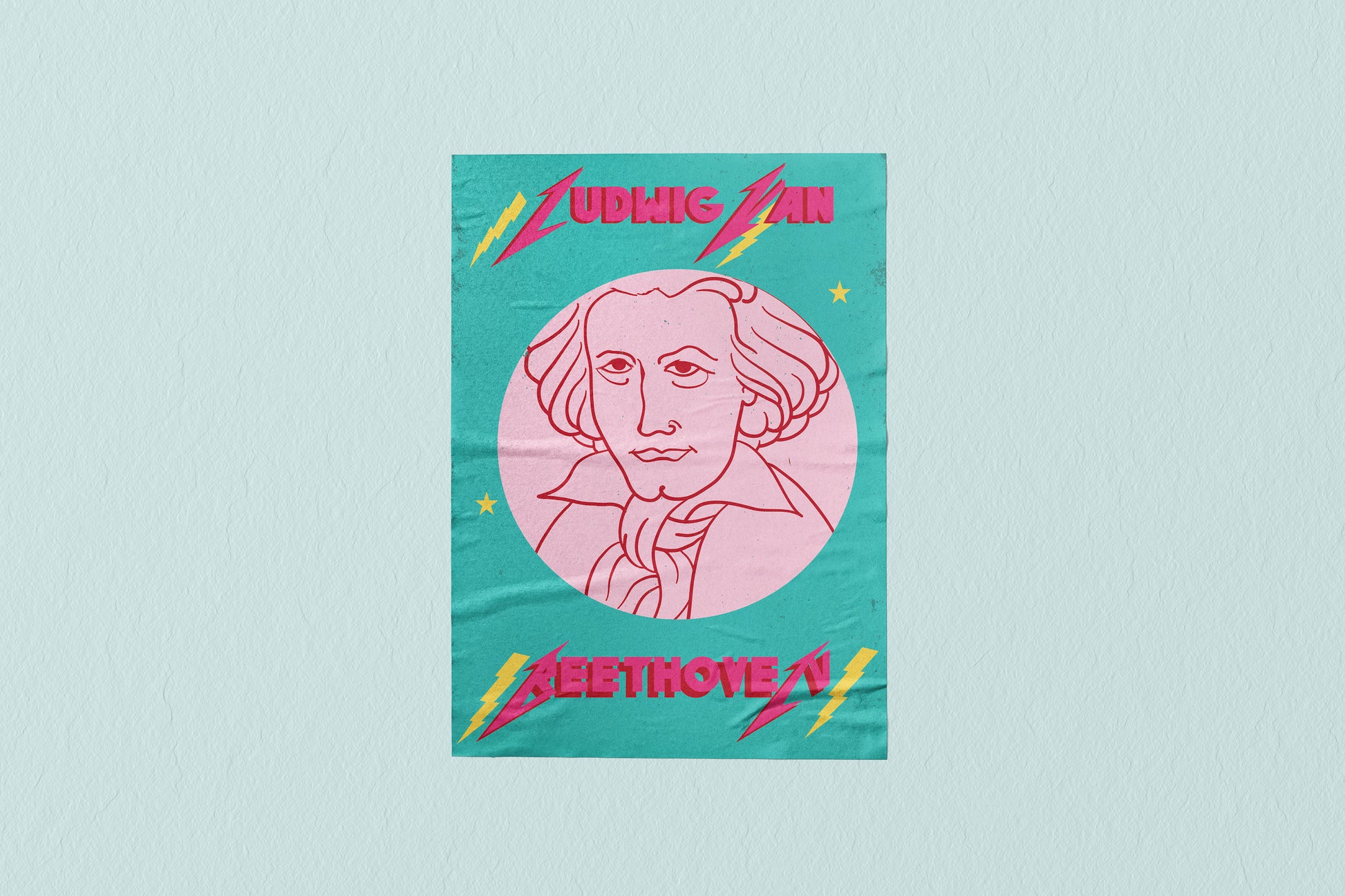When classical genius meets glam rock attitude. This electric pink poster reimagines Wolfgang Ludwig van Beethoven as a neon rock icon, complete with lightning bolts and a punk flair.