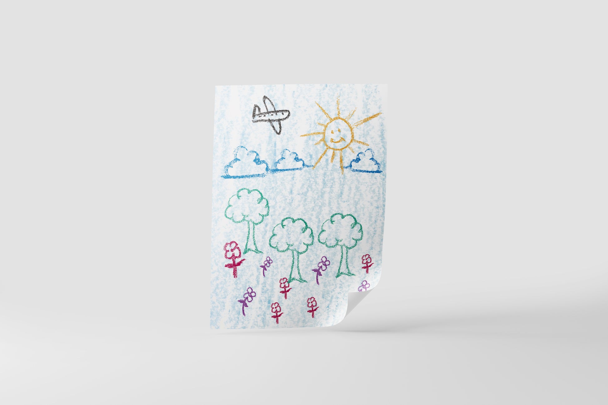 This artwork evokes the warmth and simplicity of a child’s drawing, depicting a sunny day with smiling sun, fluffy clouds, trees, flowers, and a small airplane flying overhead. Rendered in soft crayon textures with bright, cheerful colors, it feels innocent, handmade, and emotionally honest—like artwork proudly displayed in a family home.