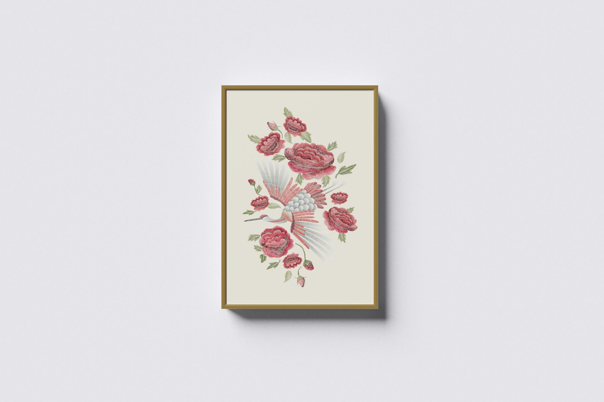 This artwork features a graceful crane in mid-flight surrounded by blooming pink roses, illustrated in a soft, muted palette with delicate detailing and classic symmetry. The composition recalls early botanical engravings and antique decorative panels, blending romantic florals with traditional bird illustration. Its airy layout and subtle tones create a timeless aesthetic ideal for period interiors, bridal boutiques, romantic bedrooms, or sophisticated film set dressing.