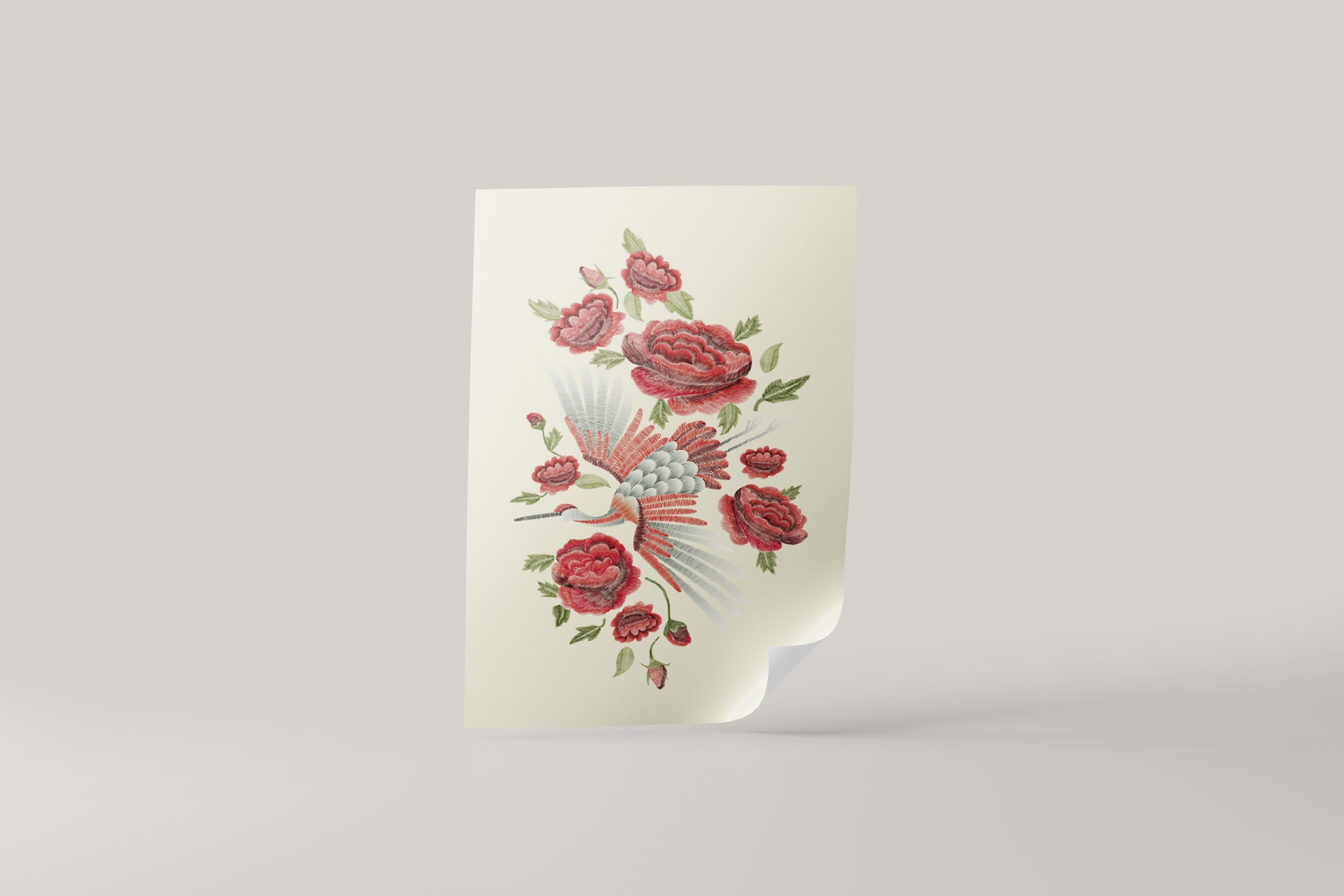 Vintage-inspired floral crane poster design, perfect as an elegant wall print or refined stage/film prop.