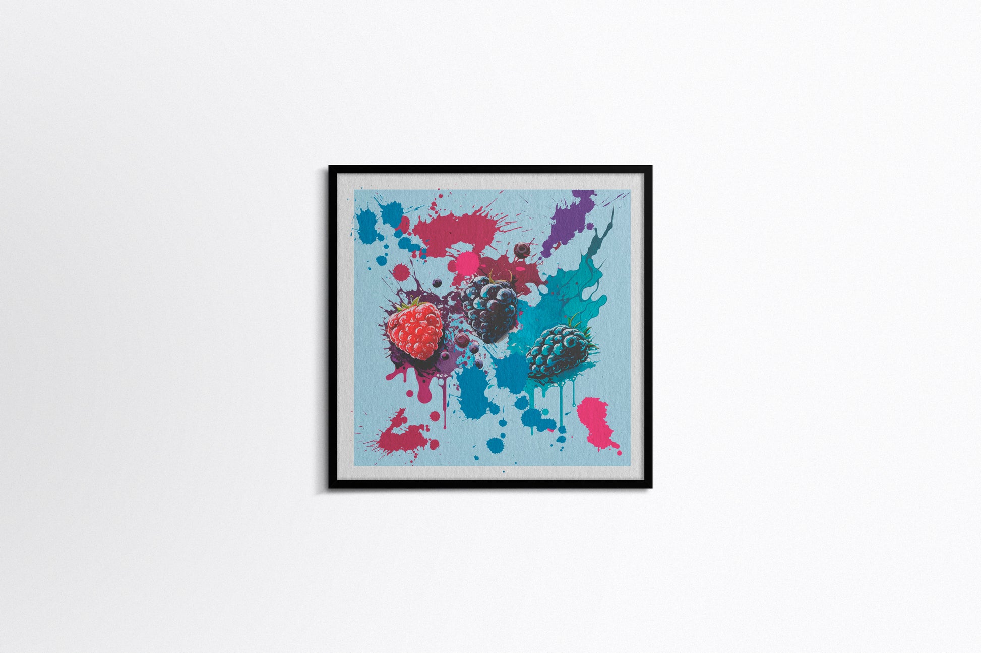 This artwork features a dynamic arrangement of berries raspberries and blackberries set against an explosion of paint splashes in electric blues, pinks, and purples. The hyper saturated colors and dripping textures evoke graffiti and contemporary urban art, blending realism with expressive abstraction. The result feels energetic and rebellious, like a fresh mural captured mid-creation.
