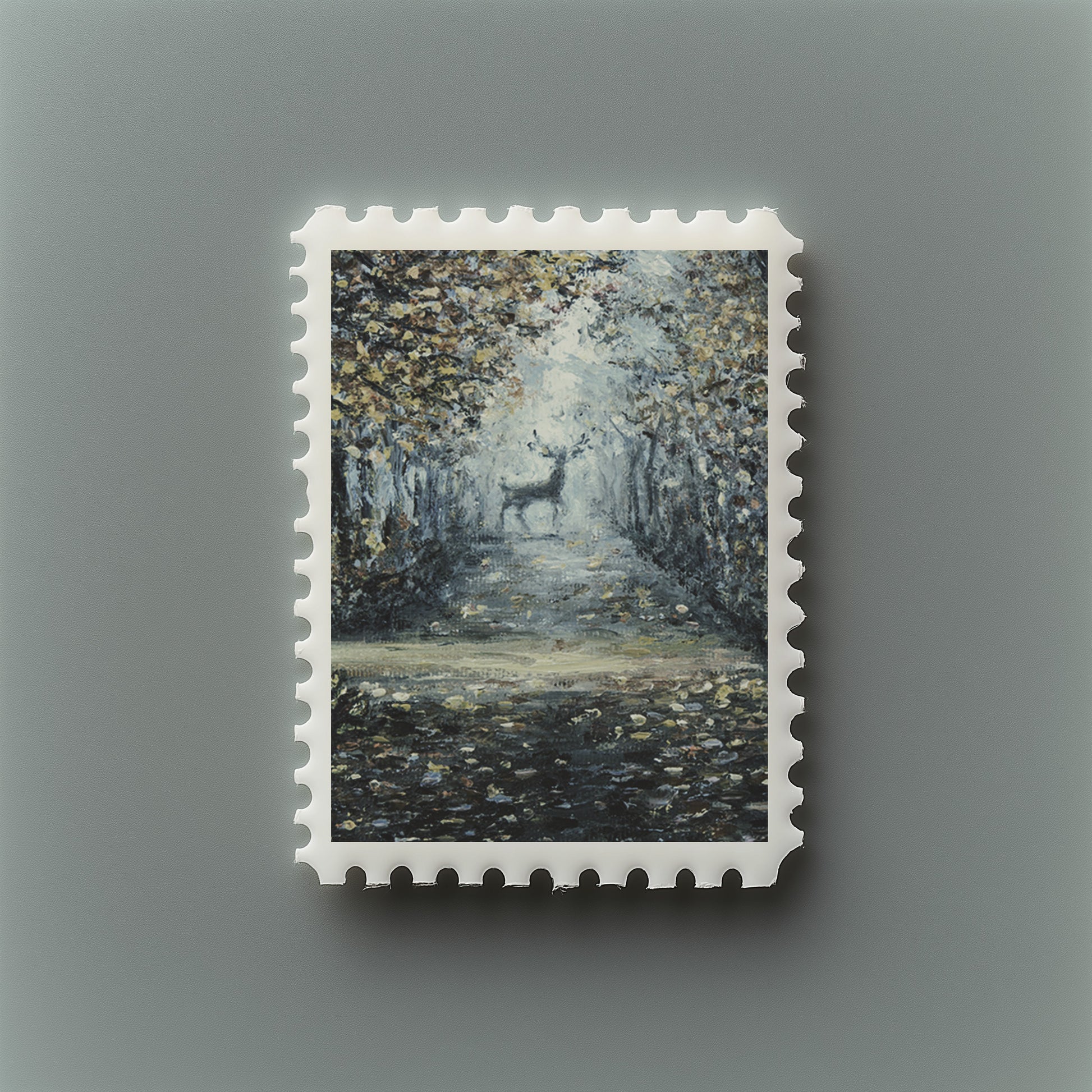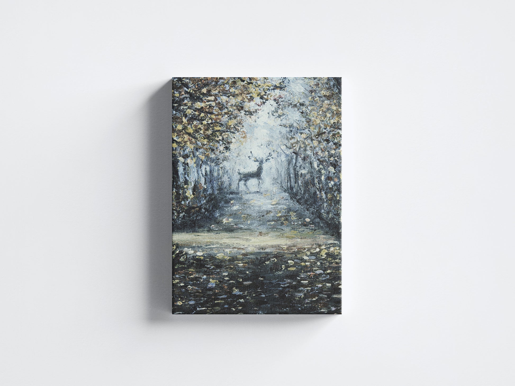 “Forest & Deer” is a moody, atmospheric painting that evokes quiet contemplation. A solitary deer stands gracefully at the end of a shadowed forest path, framed by tall trees shedding golden leaves. The soft, cool light breaking through the mist creates a dreamlike glow, while textured brushstrokes capture the layered richness of autumn and twilight.