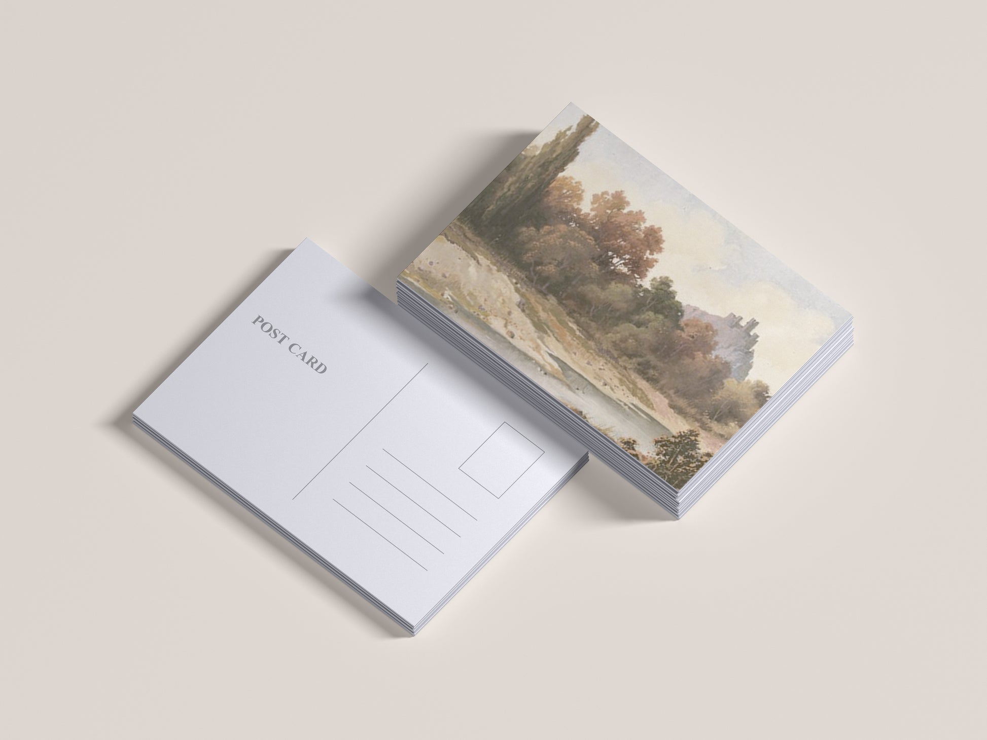 “Forest and Castle” is a classic vintage-style landscape painting featuring a quiet riverbank, lush autumnal trees, and a castle rising gently in the background. The soft, muted colors and detailed brushwork create an old-world charm perfect for evoking a sense of history and calmness.