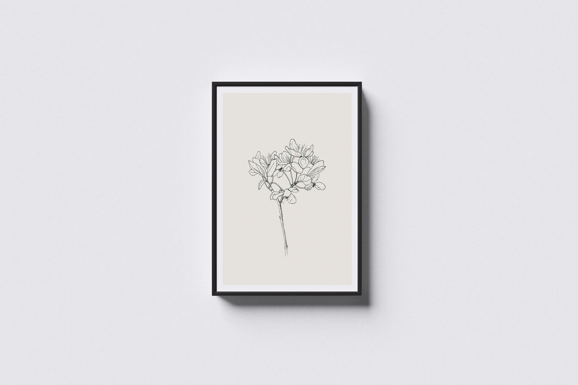 This artwork features a delicate hand-drawn floral stem rendered in fine, precise lines against a soft neutral background. The airy composition and generous negative space give it a timeless, gallery-style presence — ideal for Scandinavian interiors, contemporary apartments, boutique hotel sets, or thoughtfully styled film scenes.