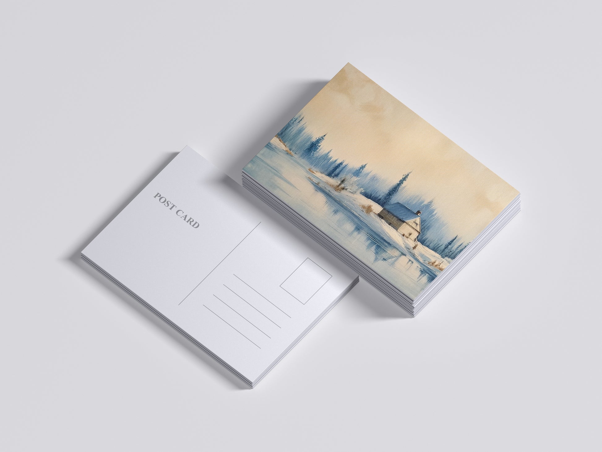 “Winter Stillness Cabin” is a contemplative and poetic winter landscape that captures the quiet intimacy of solitude in nature. A small cabin sits nestled among snowy banks, reflecting softly in a frozen lake beneath a pale amber sky. The piece is painted in a minimal, tonal style with soft brush textures, where hues of muted blue, cream, and gray dominate the scene. It evokes peaceful isolation, introspection, and the gentle hush of winter mornings.