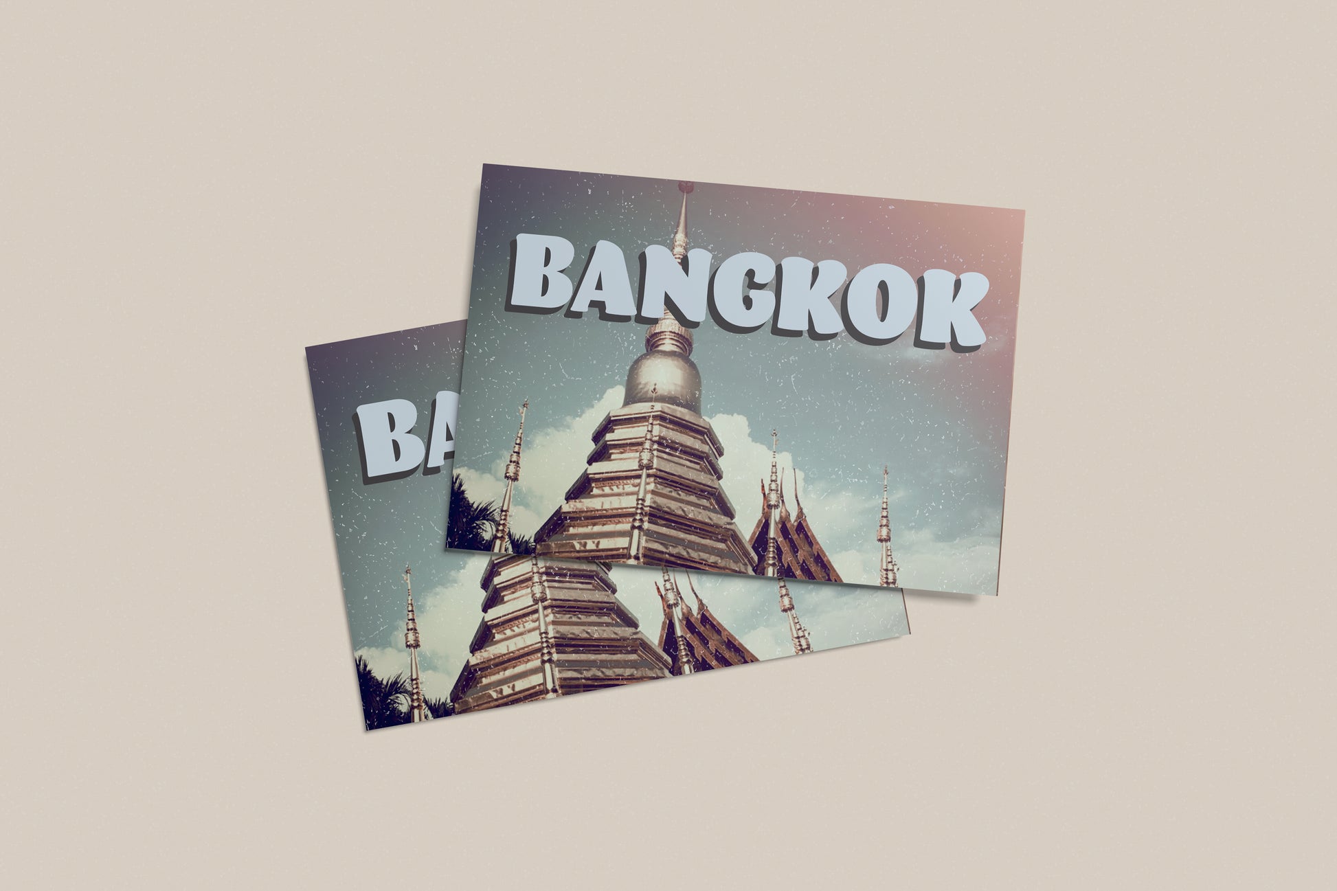 Vintage-inspired travel postcard design featuring a classic Bangkok temple silhouette with bold retro typography. This artwork evokes the feel of mid-century travel postcards, with soft pastel skies, subtle film grain, and a nostalgic color palette that feels timeless and cinematic.