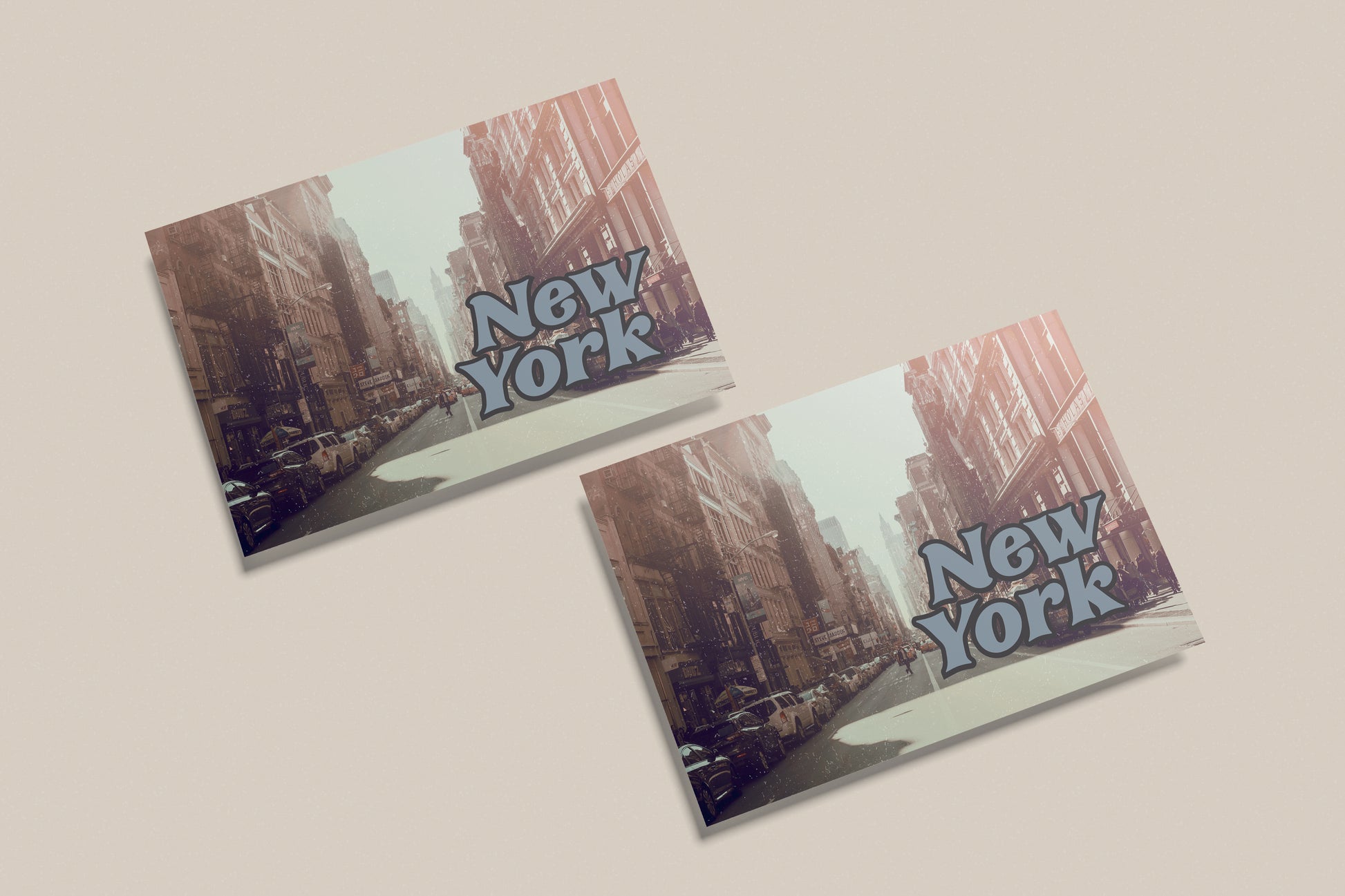 This design captures a nostalgic street-level view of New York City, featuring classic brownstone buildings, parked cars, and a soft, faded color treatment reminiscent of 1970s–1980s travel postcards. The bold “New York” lettering adds a playful retro touch, evoking old souvenir prints and cinematic urban atmospheres. The subtle grain and washed tones make it ideal for period sets or production design needing authentic city props.