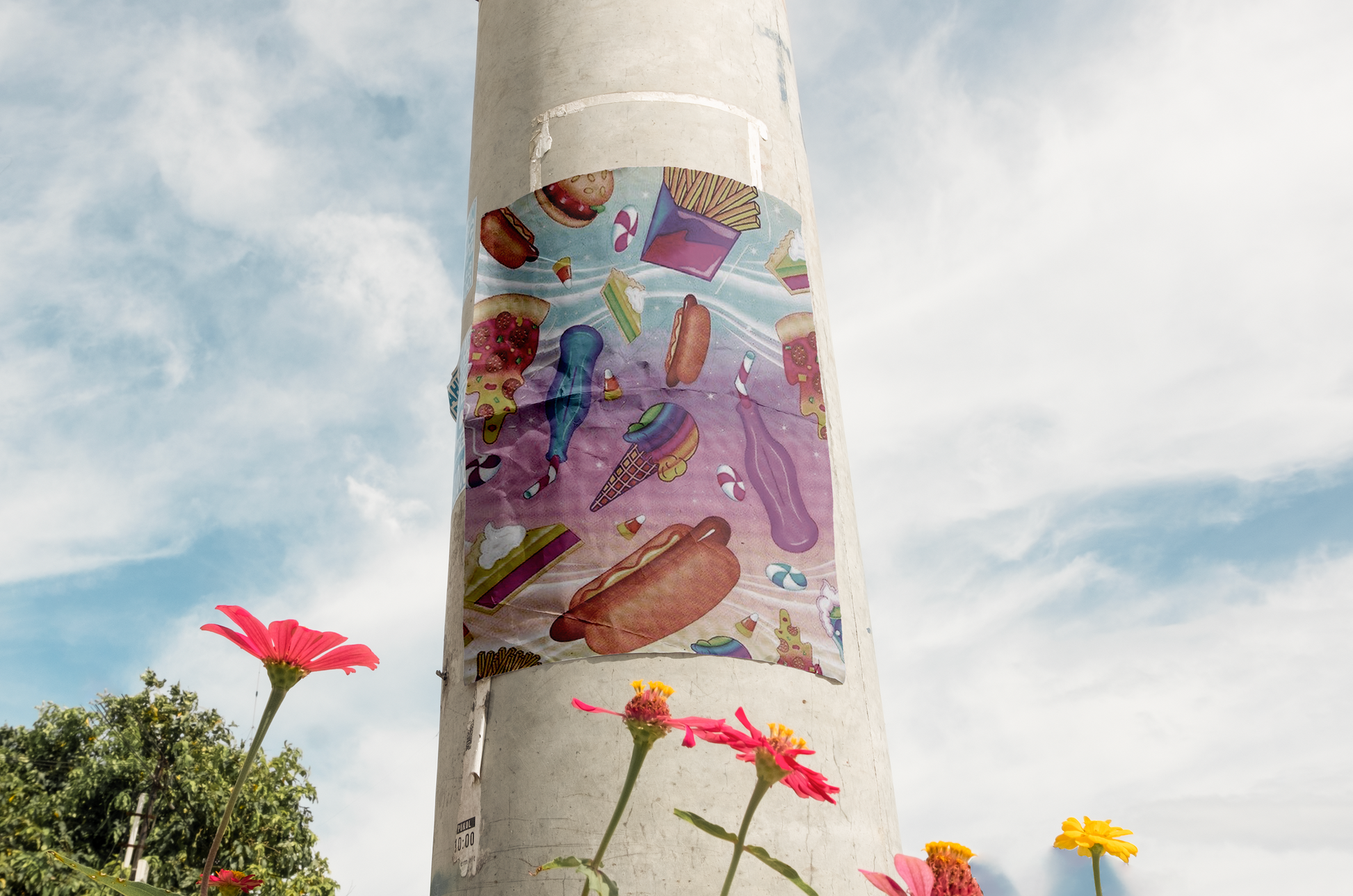 A psychedelic ode to fast food nostalgia. Hot dogs, soda bottles, rainbow ice cream, and neon fries float through a dreamy retro gradient, giving off Y2K diner vibes and cartoon surrealism.