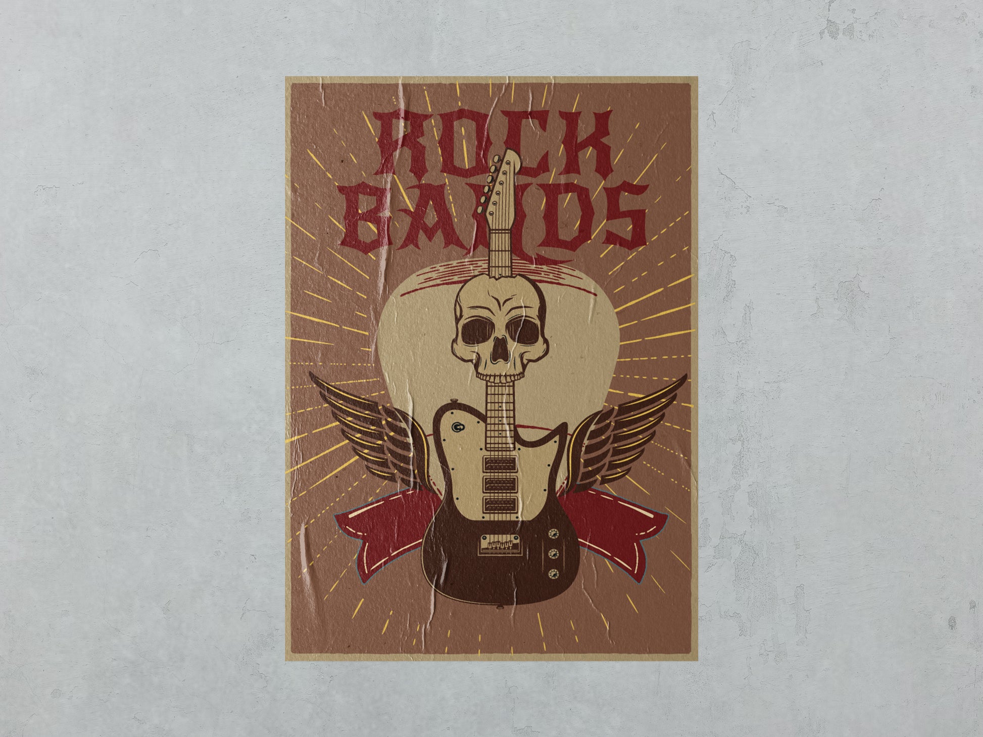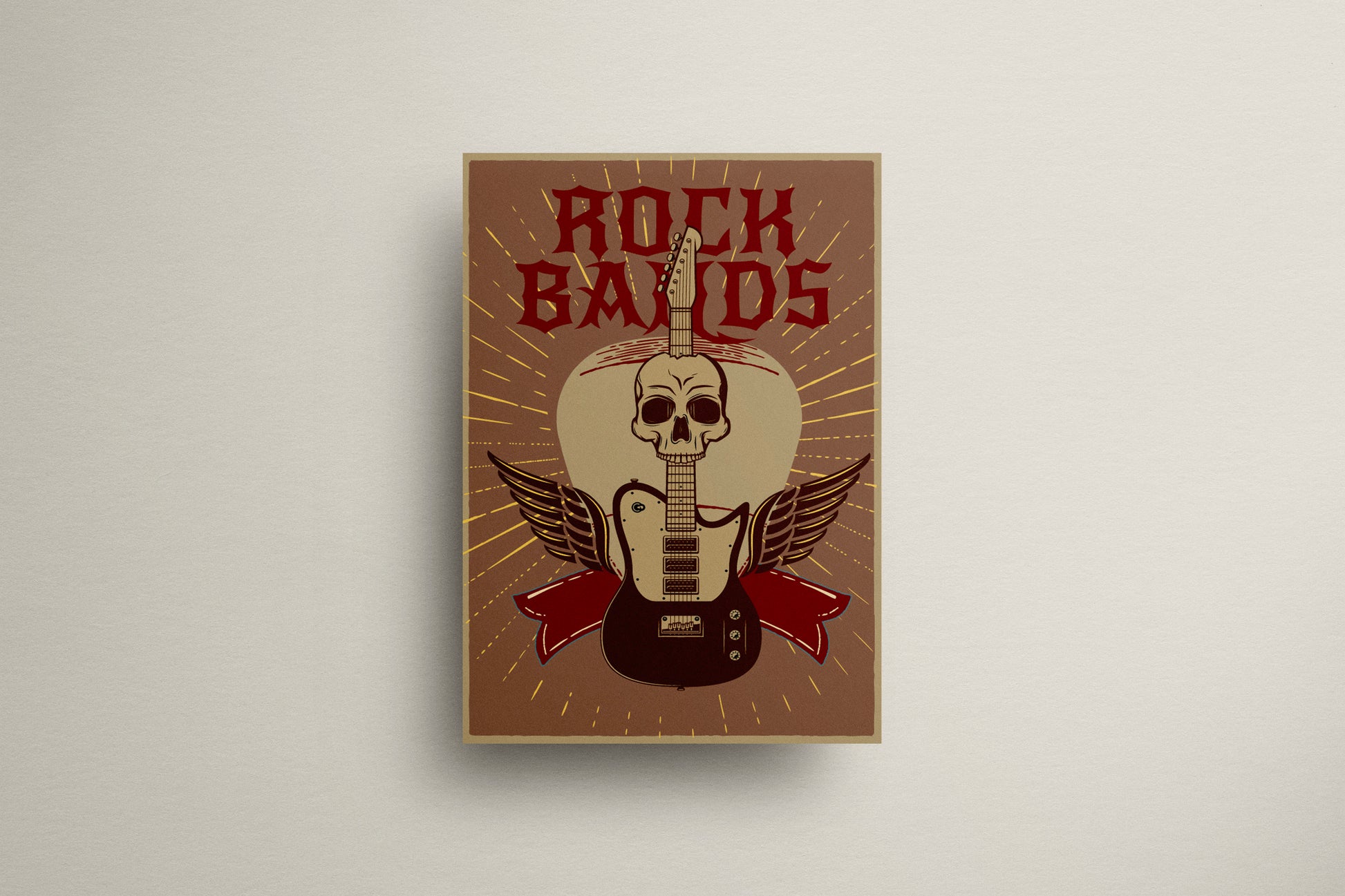 This digital artwork features a bold vintage graphic of an electric guitar fused with a skull and wings, set against a gritty brown background with distressed textures and dramatic sunburst lines. The “ROCK BANDS” headline uses heavy gothic lettering, evoking a rebellious and nostalgic underground gig poster aesthetic.