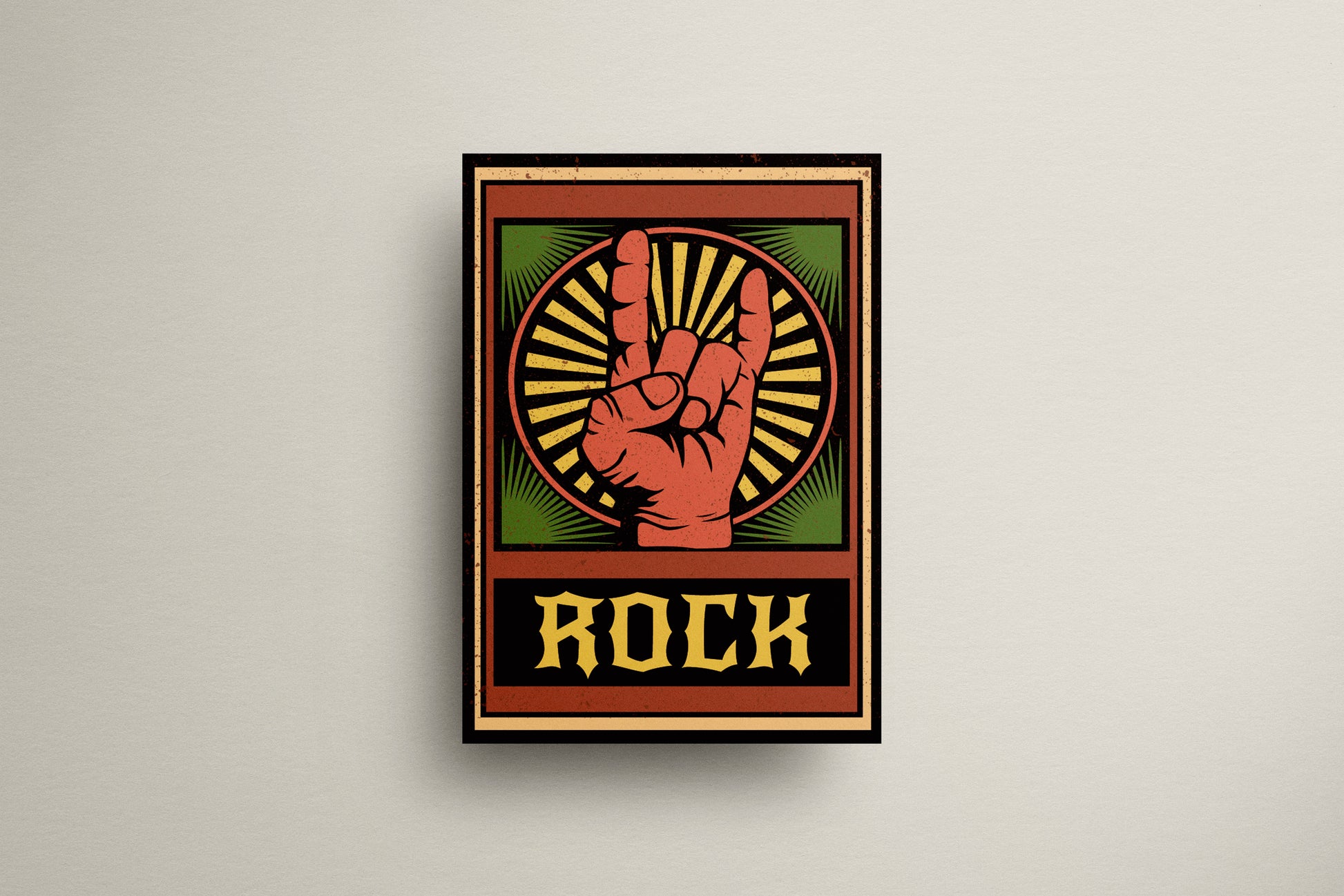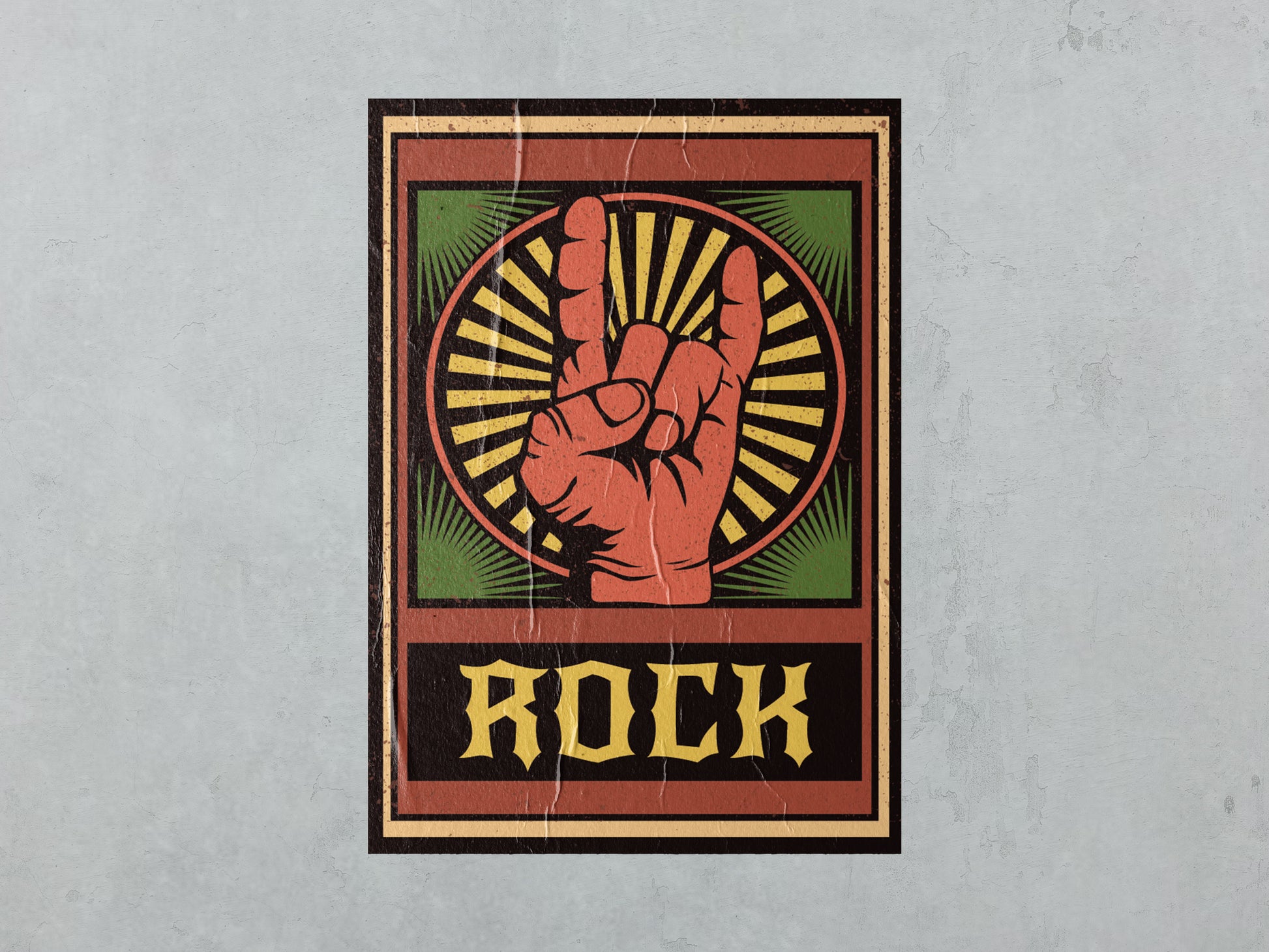 Bold retro-style “rock on” hand sign illustration, perfect as wall décor or for use as a striking prop in music-related stage or film productions.