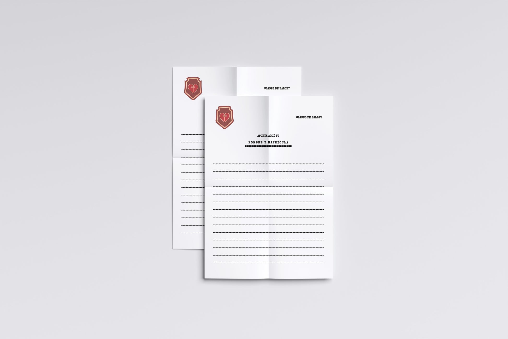 This design emulates a classic institutional registration form, featuring a clean white background, a formal serif headline that reads “Clases de Ballet”, and a structured layout inviting students to write their name and ID number. The lined section below adds realism, making it highly functional as a prop. A traditional school crest at the top-left corner reinforces the authentic academic feel, ideal for classroom scenes, administrative offices, bulletin boards, or dance-program environments in film and theater.