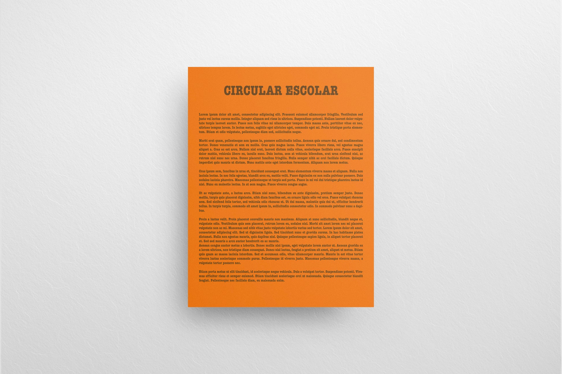 This piece features a vivid orange background paired with neatly justified black text and a prominent “CIRCULAR ESCOLAR” title in bold vintage-style serif lettering. Its clean, bureaucratic structure and pre-digital typographic feel make it a convincing piece of administrative paperwork—perfect for adding realism to classroom scenes, principal offices, notice boards, or any academic setting.