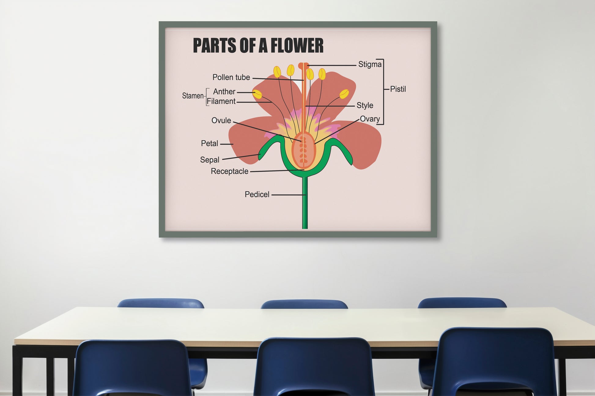 This artwork features a simplified cross-section illustration of a flower with labeled anatomical parts, including stamen, pistil, petals, sepals, ovary, and stigma. The soft pastel background, clean vector-style graphics, and bold instructional typography give it the authentic look of a real biology wall chart commonly found in schools, laboratories, and educational institutions.