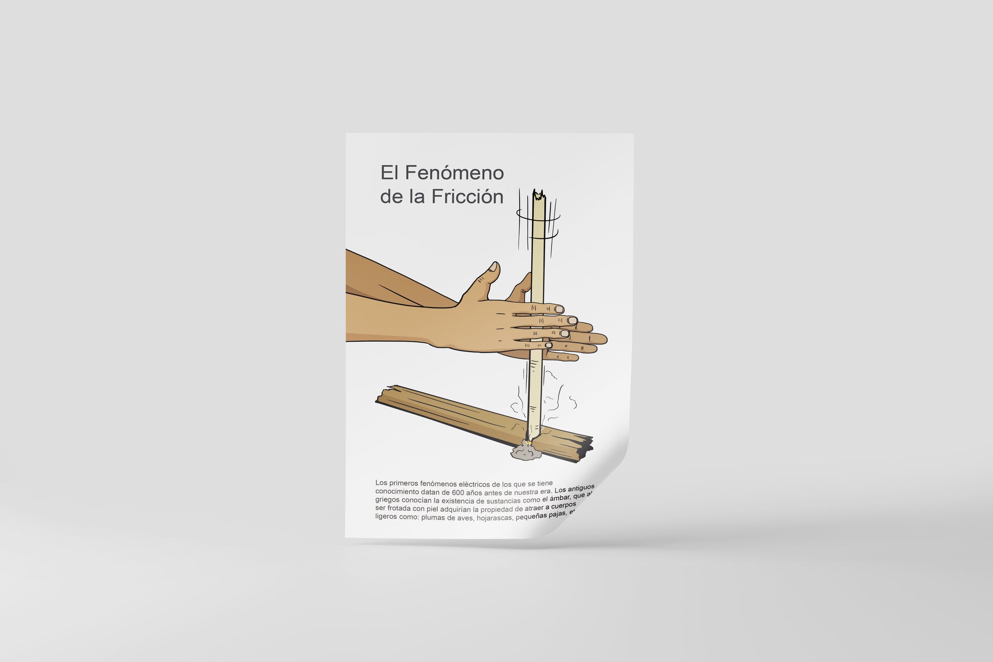 This artwork recreates the look of classic school physics posters, featuring a clear, didactic illustration of a hand rotating a wooden stick against a plank to demonstrate friction. The clean composition, restrained color palette, and Spanish title “El Fenómeno de la Fricción” give it a believable mid-century academic feel, similar to posters found in public school classrooms or old science labs.