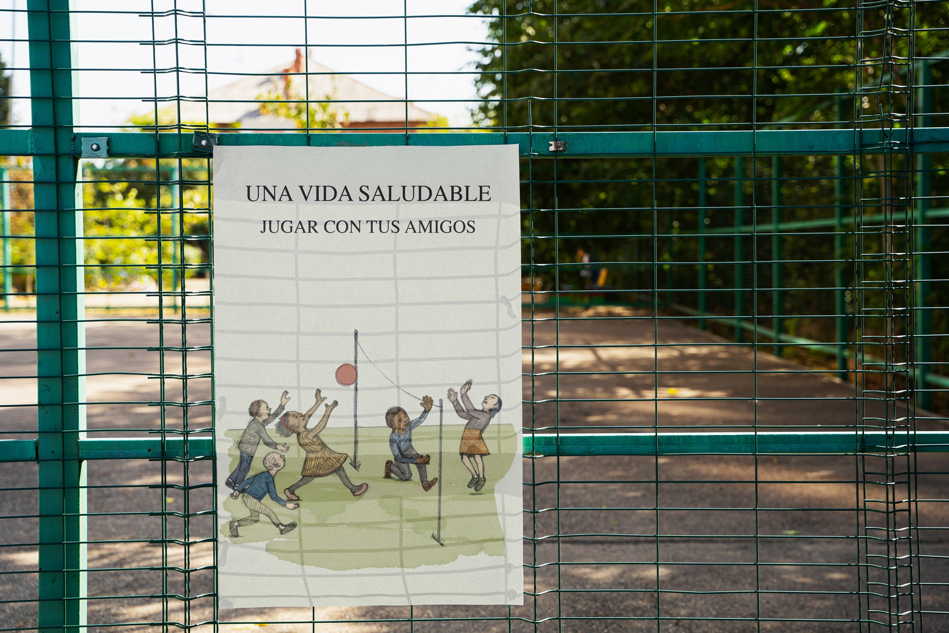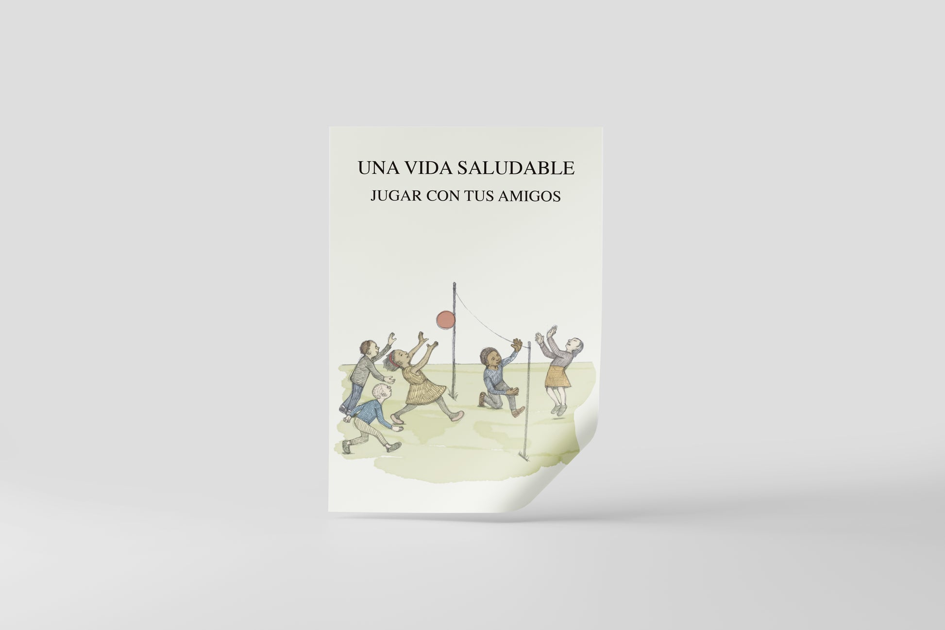 This artwork depicts a group of children playing outdoors with a ball, rendered in a soft, hand-drawn illustration style inspired by mid-20th-century schoolbooks and public health posters. The Spanish headline “Una vida saludable – Jugar con tus amigos” reinforces the educational tone, while the muted color palette, gentle watercolor textures, and aged paper look give it the authenticity of an old classroom or institutional poster.
