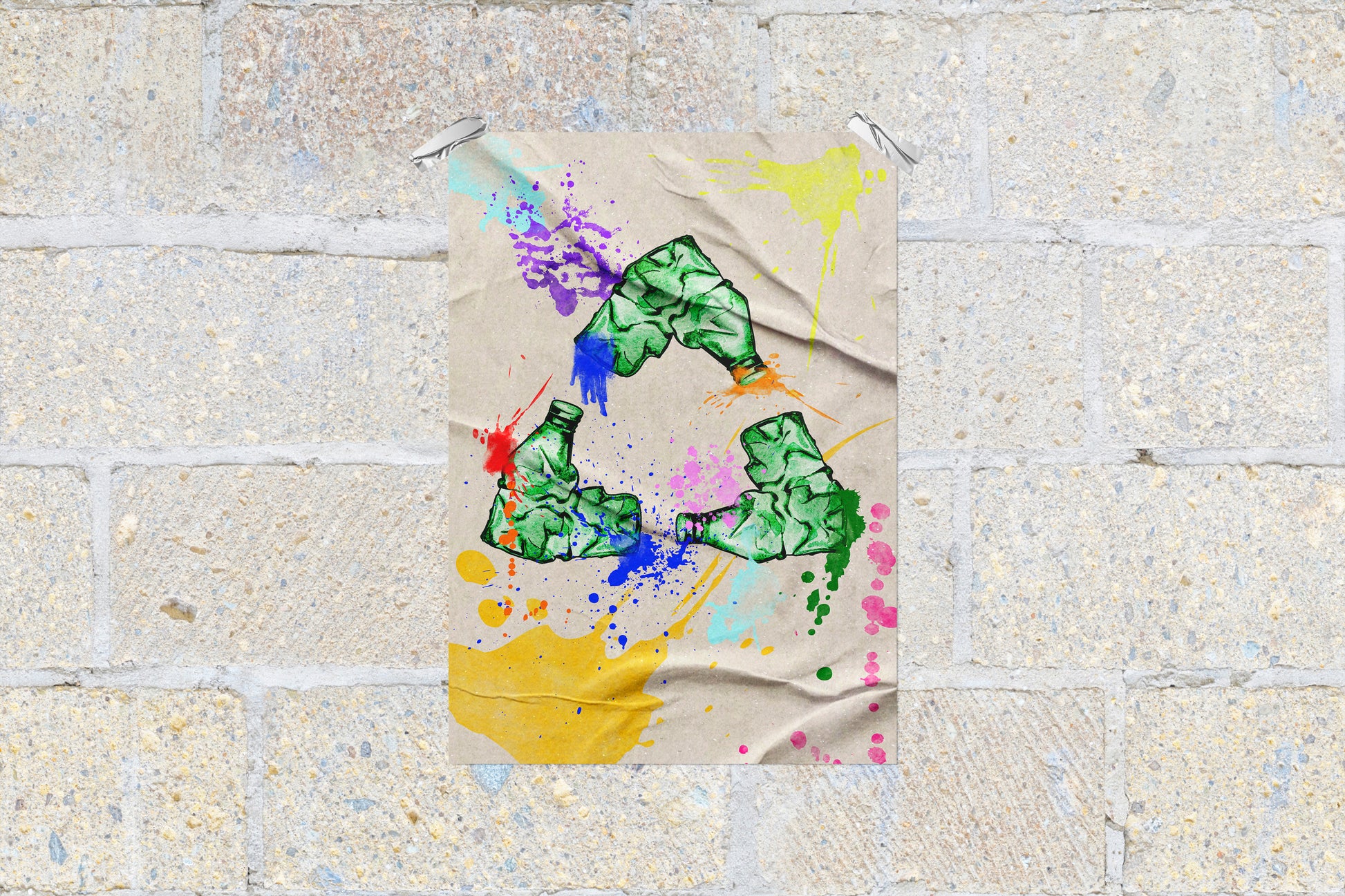 This illustrated poster features a recycling symbol constructed from crushed plastic bottles, set against a textured paper background splashed with vibrant, expressive paint marks. The contrast between the green recycled bottles and the colorful splatters creates a dynamic, modern look that feels both educational and rebellious—perfect for settings that blend environmental messaging with urban or creative energy.