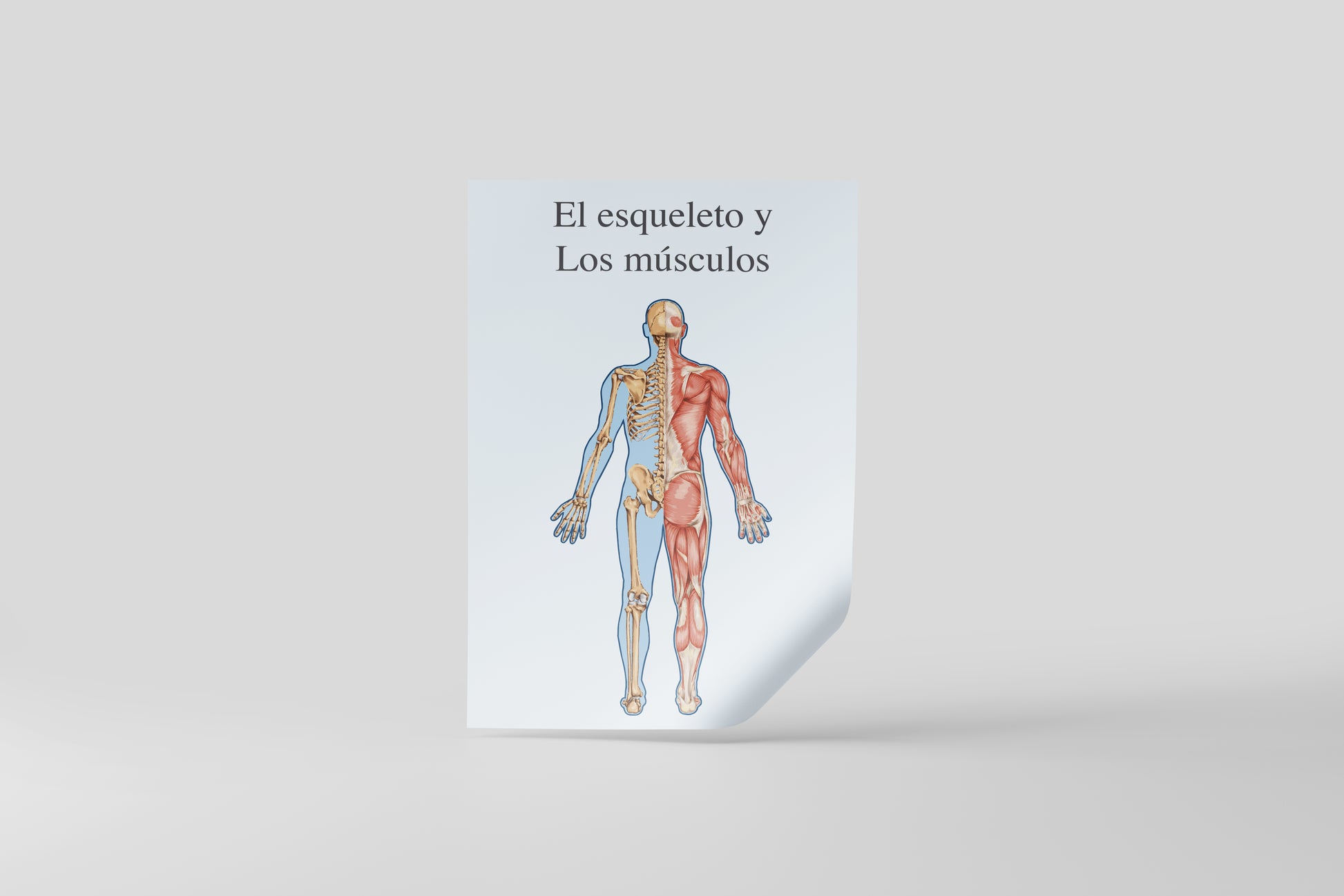 This artwork features a human figure split between skeleton and muscular system, presented in a clear, didactic layout inspired by traditional classroom anatomy posters. The illustration balances scientific accuracy with a clean, neutral background and restrained color palette, giving it an authentic educational feel suitable for both historical and contemporary settings.