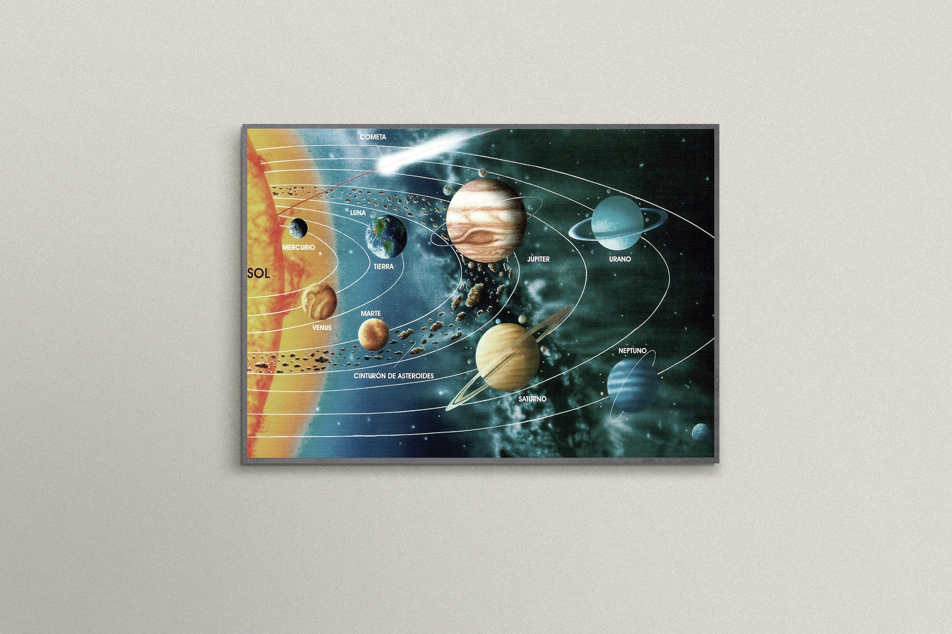 This artwork presents a richly illustrated view of the solar system with labeled planets in Spanish, orbital paths, the asteroid belt, and a comet, all set against a dramatic cosmic background. The textured colors and slightly aged look evoke traditional educational prints, making it feel authentic and believable on camera as a real classroom or institutional wall chart.