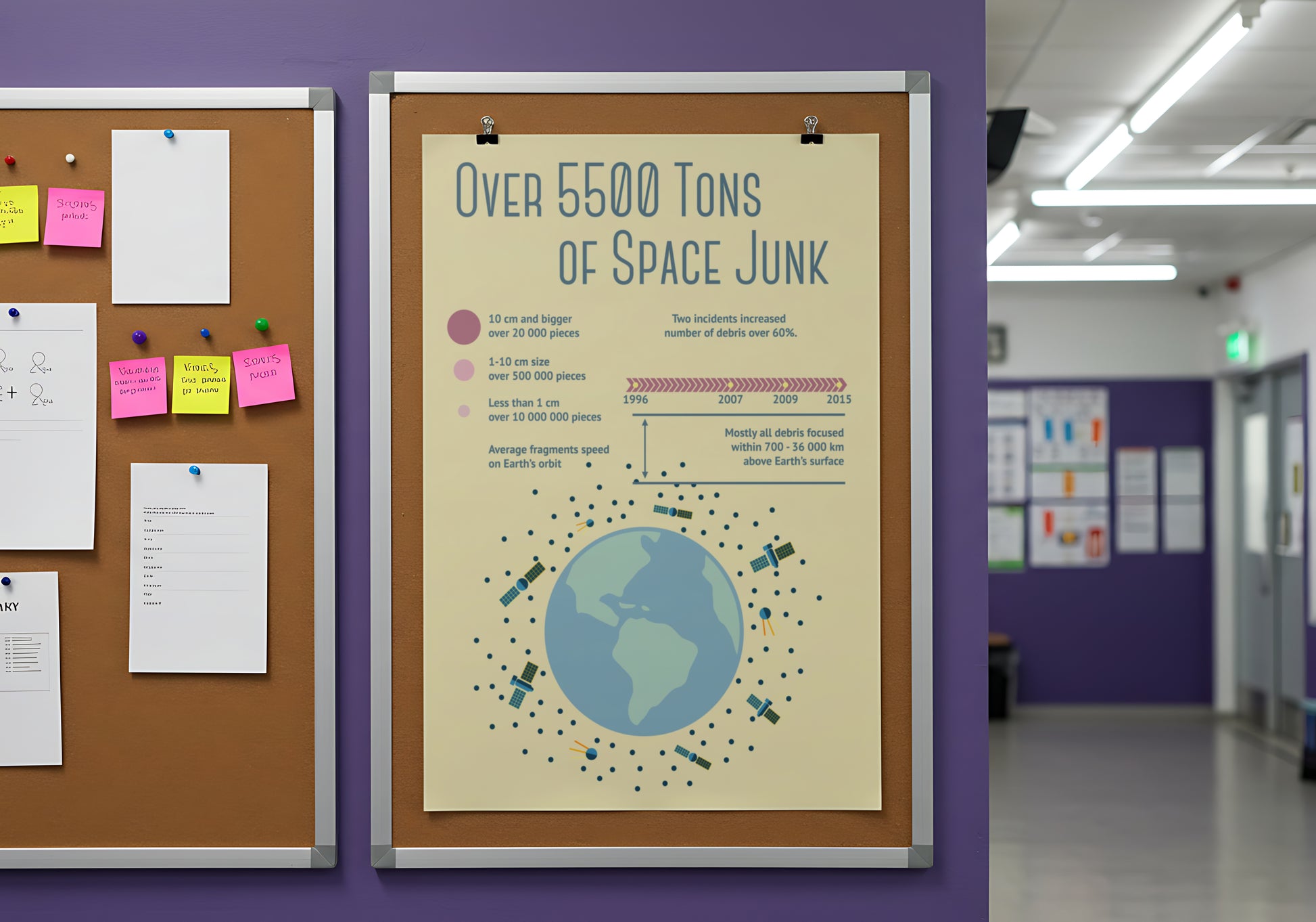 This artwork illustrates the growing problem of space junk orbiting Earth, using clean diagrams, soft pastel tones, and minimalist typography reminiscent of mid-century educational posters. Featuring data-driven visuals, orbital timelines, and stylized satellites surrounding the planet, it feels like an authentic classroom or research facility chart—perfect for believable world-building in visual storytelling.