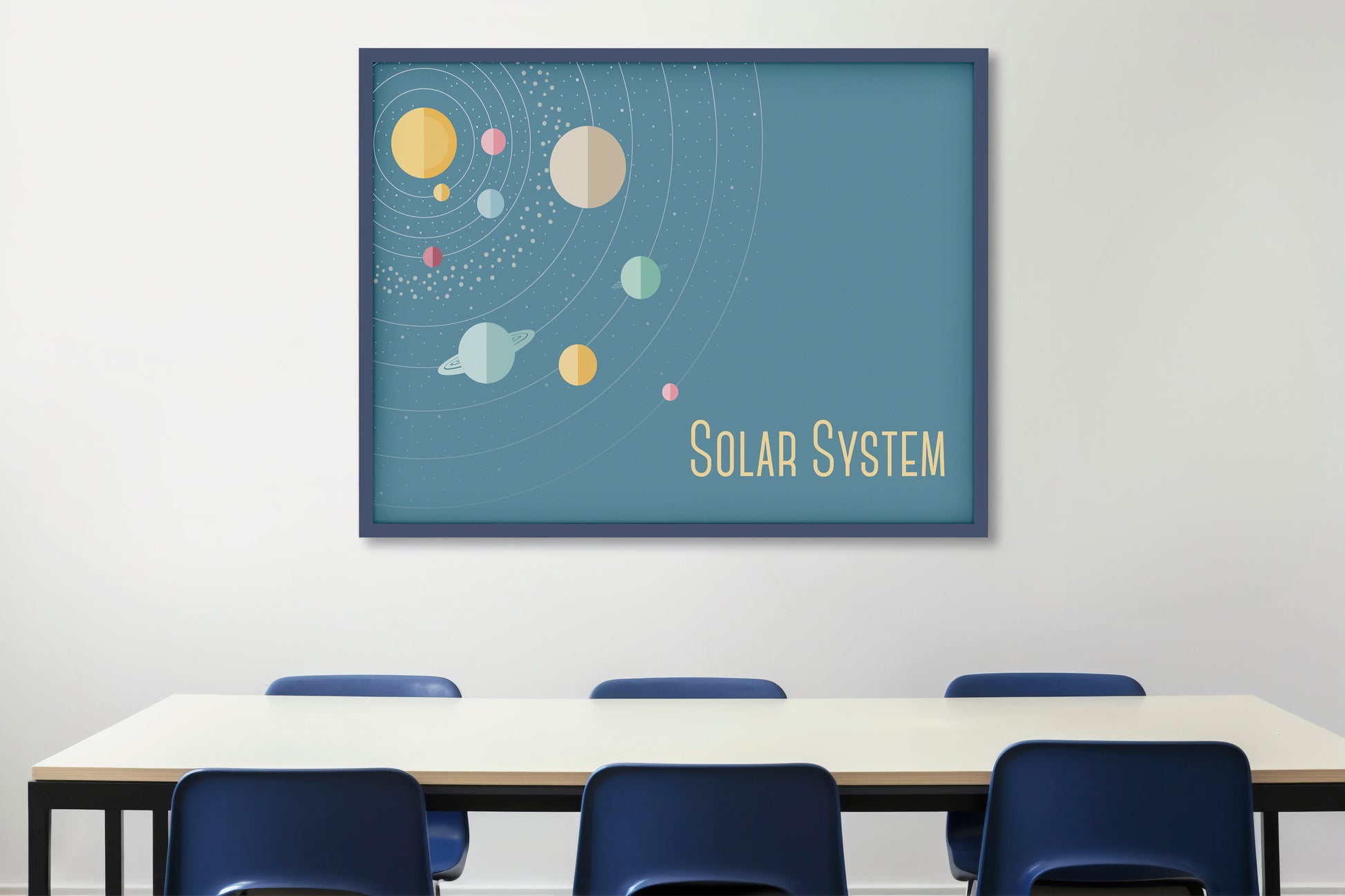 This minimalist illustration presents the Solar System through simplified planetary shapes, clean orbital lines, and a muted retro color palette. The flat graphic style and balanced composition recall vintage school science posters from the 1950s–1970s, making it feel authentic and understated. Its calm blue background and playful celestial elements create a believable educational prop without overpowering the set.