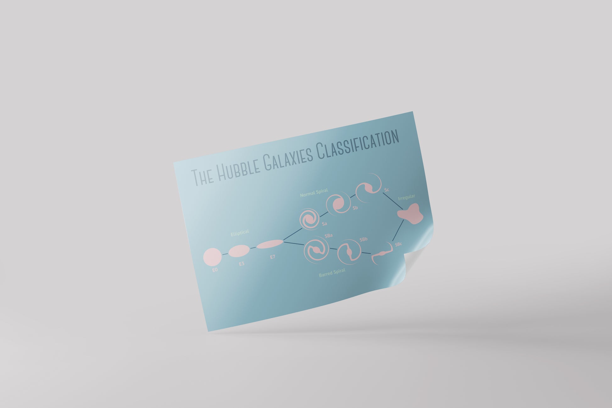 Minimalist educational astronomy wall poster illustrating The Hubble Galaxies Classification, designed as a clean scientific diagram suitable for classrooms, observatories, or as a realistic academic prop for film and television productions.