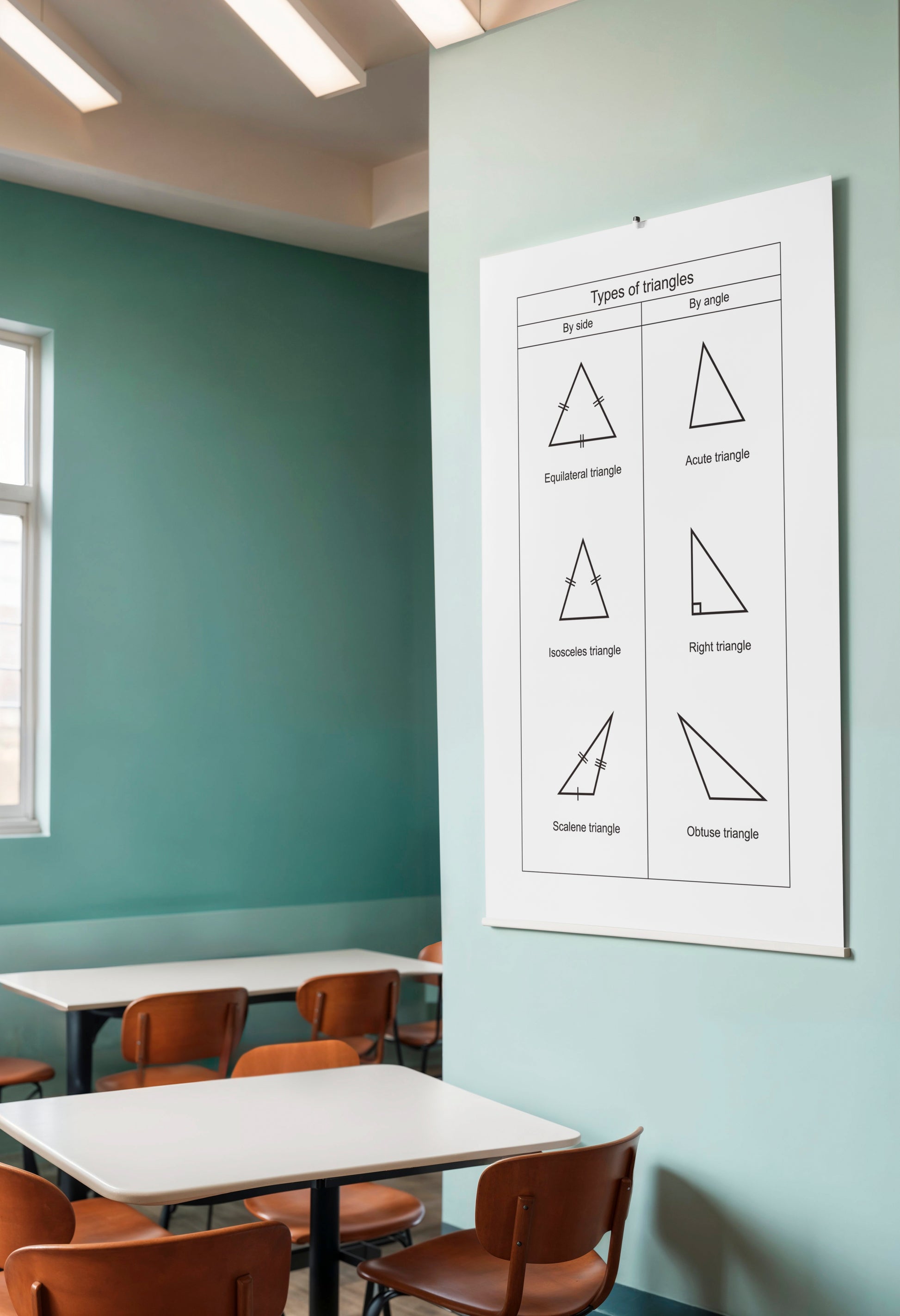 This artwork reproduces the clean, instructional style of traditional school math charts, presenting the types of triangles classified by side and by angle. Simple black line diagrams, precise labels, and a neutral white background give it an unmistakable institutional look, reminiscent of posters found in classrooms, math labs, and hallways. Its restrained graphic language makes it highly believable as a real educational aid.